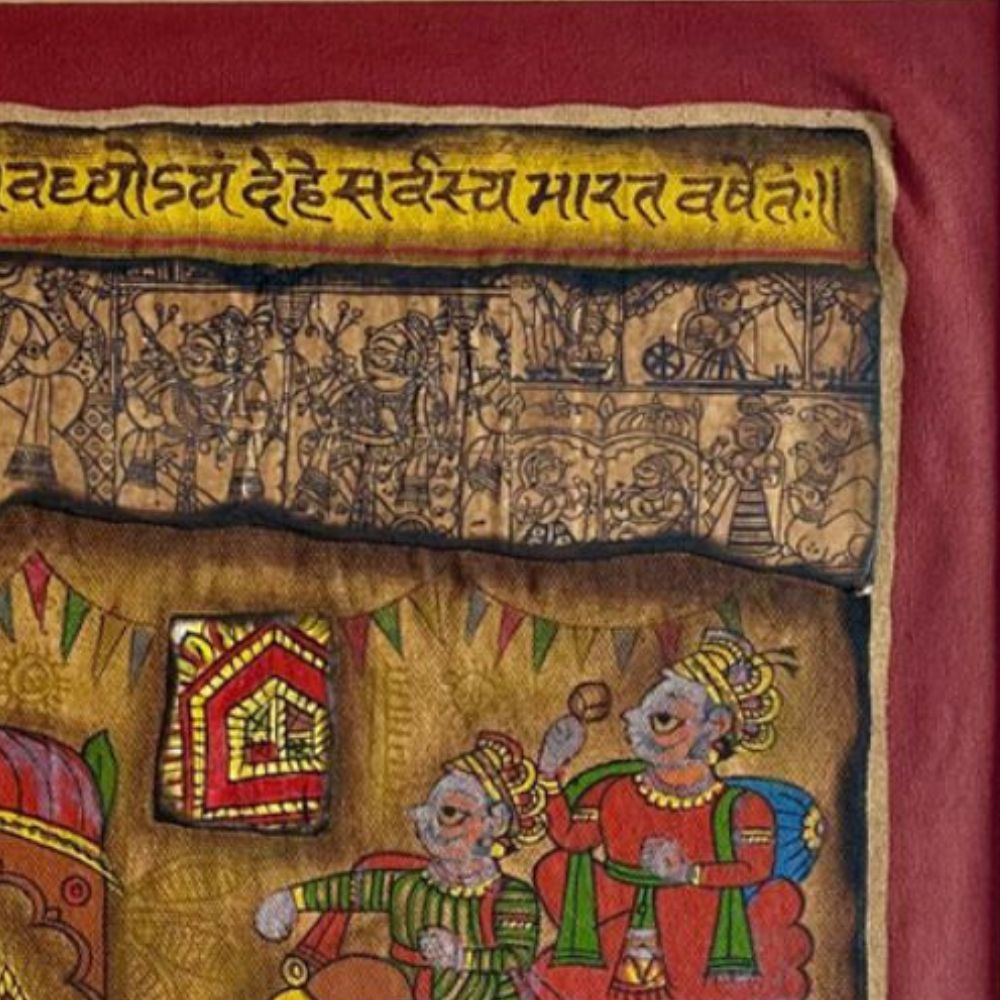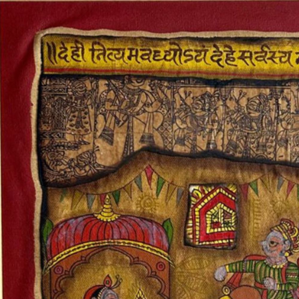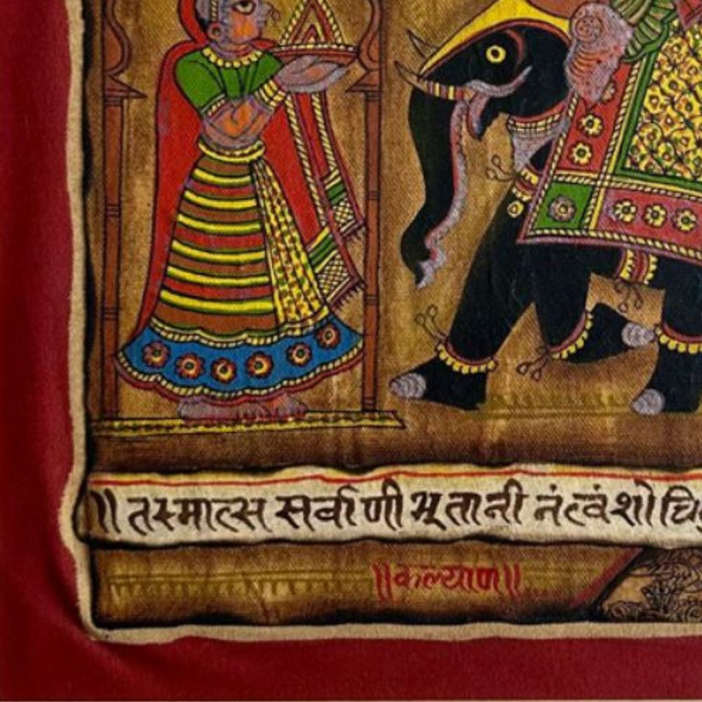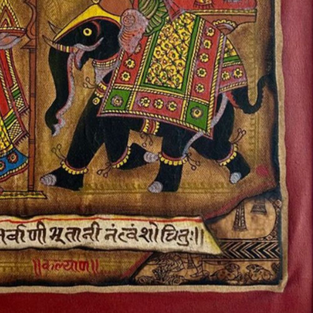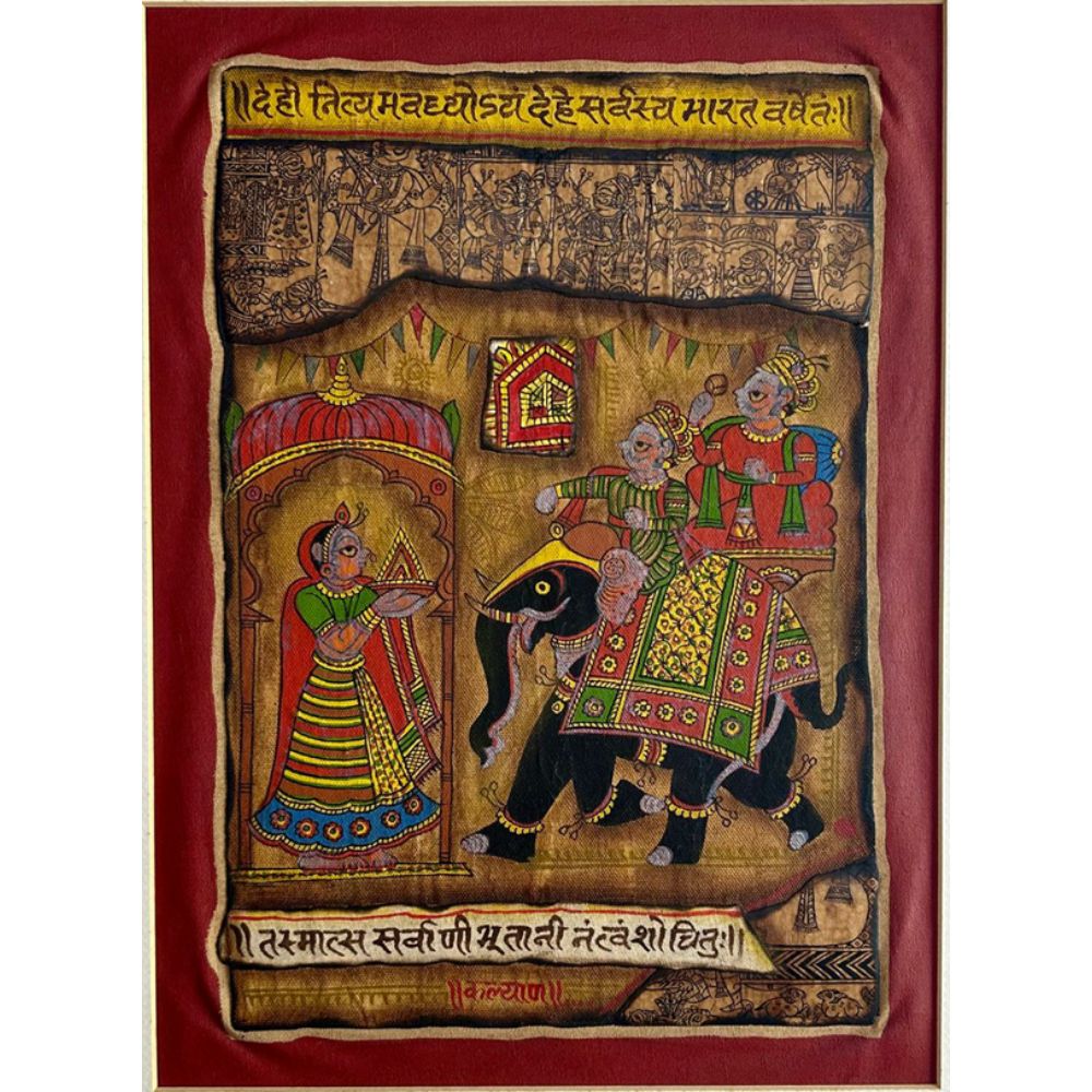 "Wedding Procession" is a magnificent Phad Painting in raw colour on cloth, capturing the grandeur and cultural richness of traditional Indian weddings. Rooted in Rajasthan’s folk art heritage, Phad paintings are narrative scrolls used to depict stories of deities, kings, and everyday life. This artwork brings that tradition alive with its intricate storytelling, vibrant pigments, and rustic textures. The composition illustrates a royal wedding scene, where the groom, elegantly dressed, is seated atop a richly adorned elephant, accompanied by attendants. Opposite them, the bride is depicted within an ornate palace structure, awaiting the ceremonial union. Every detail - from the regal costumes and festive banners to the decorative patterns on the elephant - reflects the celebratory spirit of Indian matrimonial traditions. The use of raw natural colours on cloth enhances its authenticity, while the Devanagari script woven into the design anchors it in devotional and cultural context. The earthy reds, greens, and yellows add warmth and festivity, making the painting not just a visual delight but also a historical archive of customs. Perfect for collectors and lovers of folk art, this piece resonates with themes of joy, unity, and tradition.
