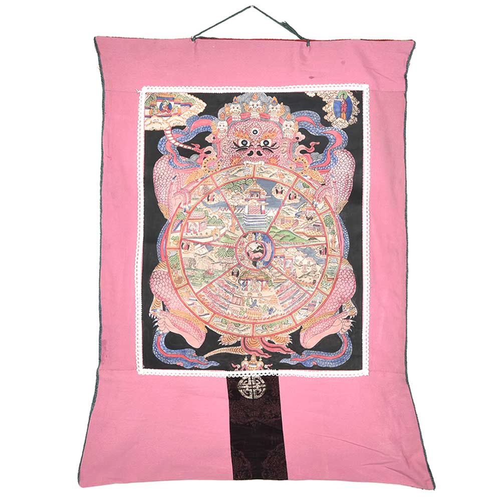 This hand painted blue thangka depicts the Wheel of Life. The Wheel of Life or Bhavachakra is one of the most fascinating subjects of the Buddhist Thangka paintings. It is rich in symbolism, and captures the key aspects of the Buddha's teaching, including rebirth, Karma and dependent origination.
