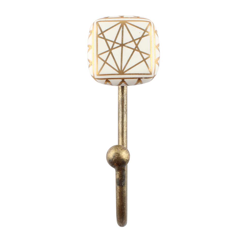 Material: Glazed ceramic tile with antique-finish iron hook Finish: Glossy white ceramic with golden detailing, matte antique iron base Installation: Concealed screw-mount system for a seamless, elegant appearance