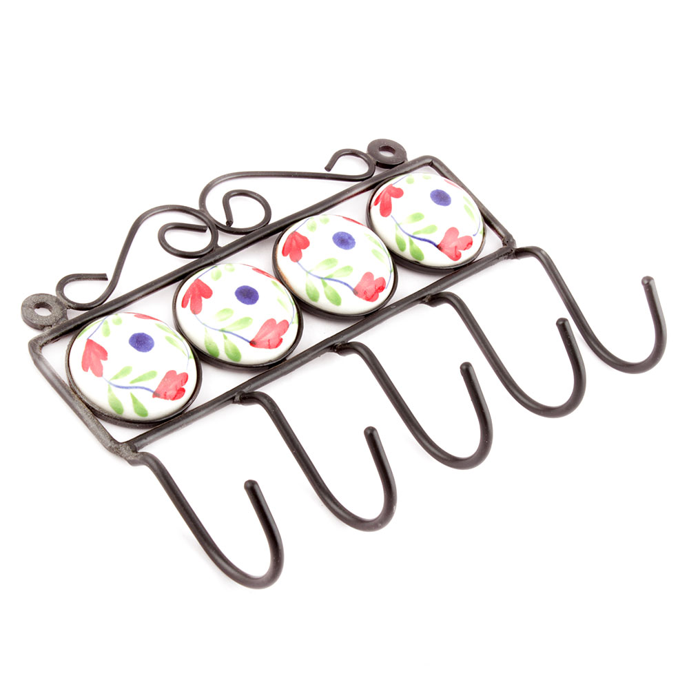 White And Red Floral Ceramic Tiles Hooks. When Put on Wall or Cabinet it is an Art in itself. The Metal Part of this Hook is Black Powder Coated.
