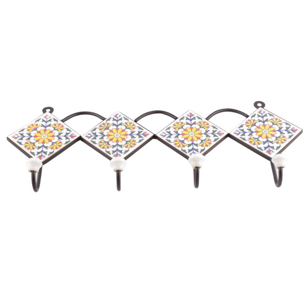 White And Yellow Sunflower Ceramic Tiles Hooks Online. When Put on Wall or Cabinet It is An Art in Itself. The Metal Part of this Hook is Black Powder Coated.