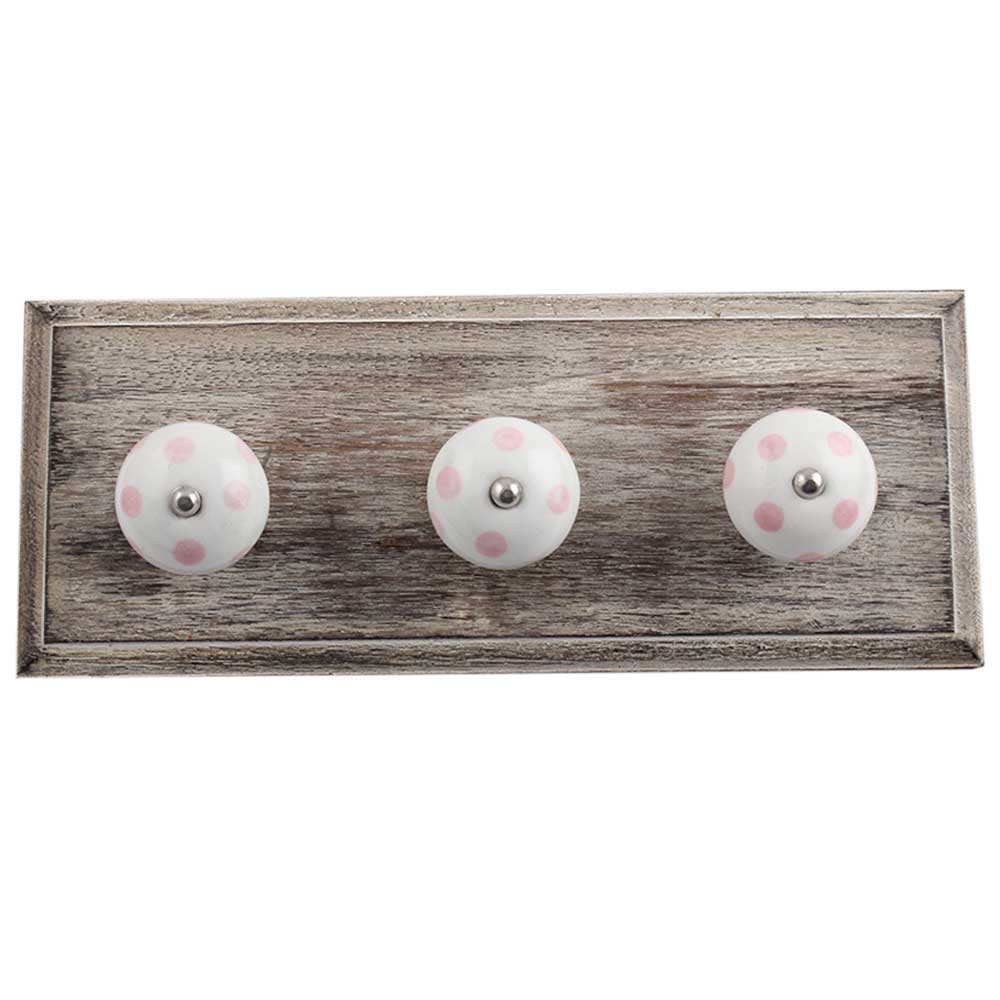 White Baby Pink Dot Wooden Hooks . A Perfect Complement to the Soft Tone of the Wood are these White Traditional Hat Coat Hook Made of Genuine Porcelain and Brass. It can be use to Hang Jewellery, Leashes, Towels, Scarves, Light Weight Sweaters, Caps Etc.