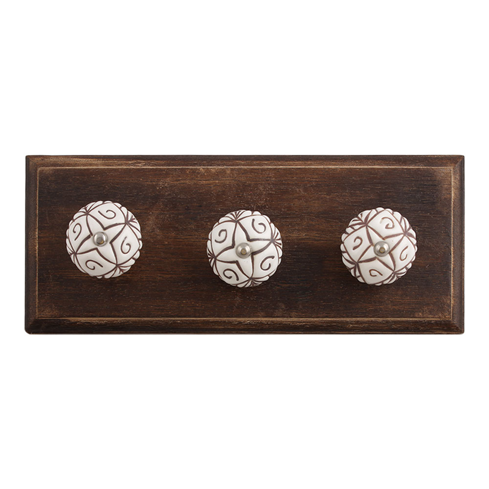 White Base Brown Etched Ceramic Floral Wooden Hook. A Perfect Complement to the Soft Tone of the Wood are these White Traditional Hat & Coat Hook Made of Genuine Porcelain and Brass. It can be use to Hang Jewellery, Leashes, Towels, Scarves, Light Weight Sweaters, Caps Etc.