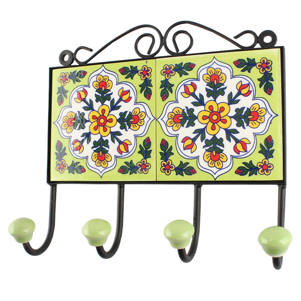 White Ceramic Floral Tile Hook. When Put on Wall or Cabinet It is An Art in Itself. The Metal Part of this Hook is Black Powder Coated.