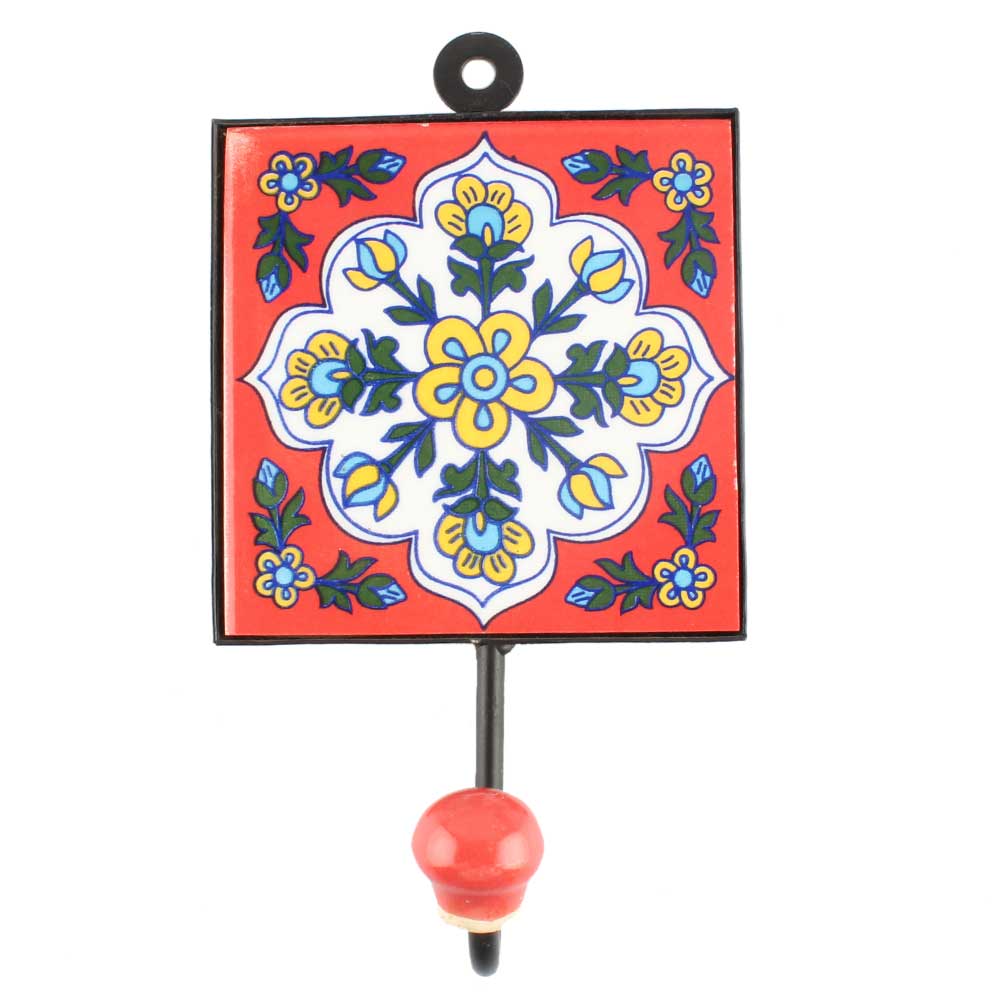 White Ceramic Floral Tile Hook Online. When Put on Wall or Cabinet It is An Art in Itself. The Metal Part of this Hook is Black Powder Coated.