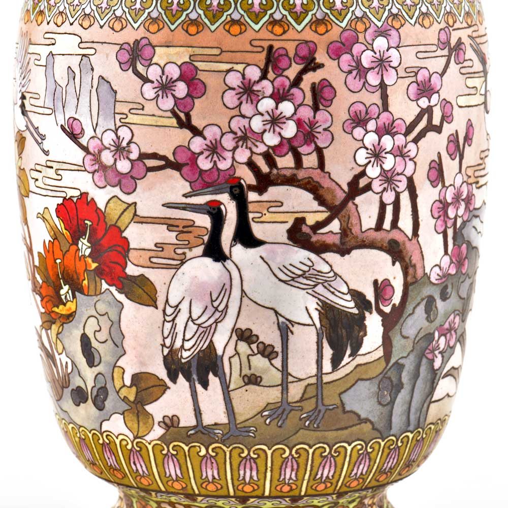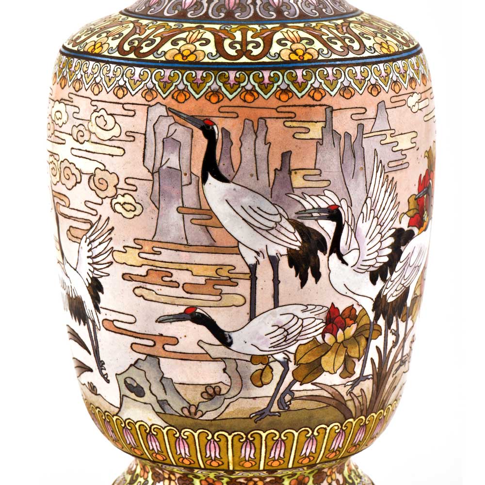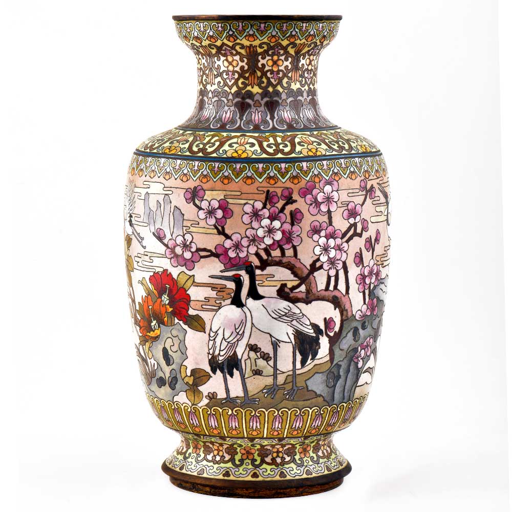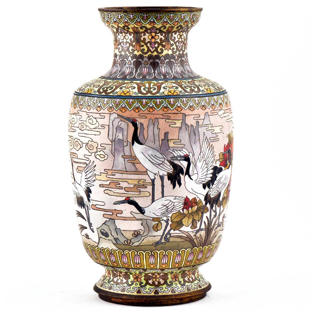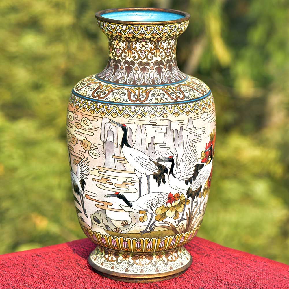 This Is Absolutely Fabulous, Highly Collectable & Beautifully Detailed White color Cloisonné Enamel Vase. It Features a Very Charming & Traditional patterned design in black with cranes, lot of flowers and beautiful landscape in the background. Decorative enameled metal cloisonné exhibit almost superhuman skill by master craftsmen displayed by the marvelous diversity, intricacy and beauty of their designs