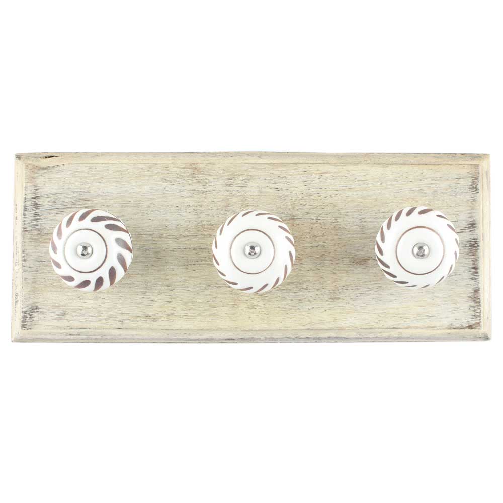 White Etched Ceramic Floral Wooden Hooks. A Perfect Complement to the Soft Tone of the Wood are these White Traditional Hat and Coat Hook Made of Genuine Porcelain and Brass. It can be used to Hang Jewelry, Leashes, Towels, Scarves, Light Weight Sweaters, Caps etc.