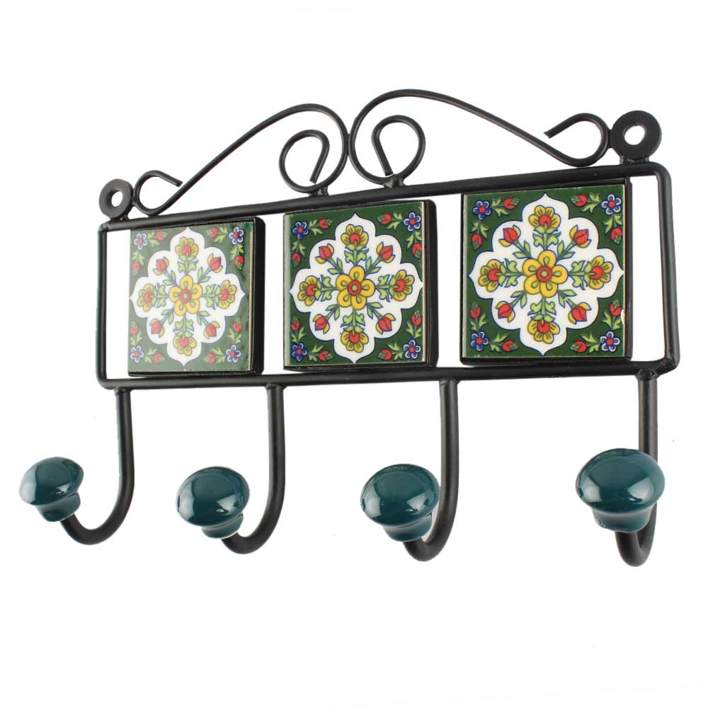 White Floral Ceramic Tile Hook. When Put on Wall or Cabinet It is An Art in Itself. The Metal Part of this Hook is Black Powder Coated.