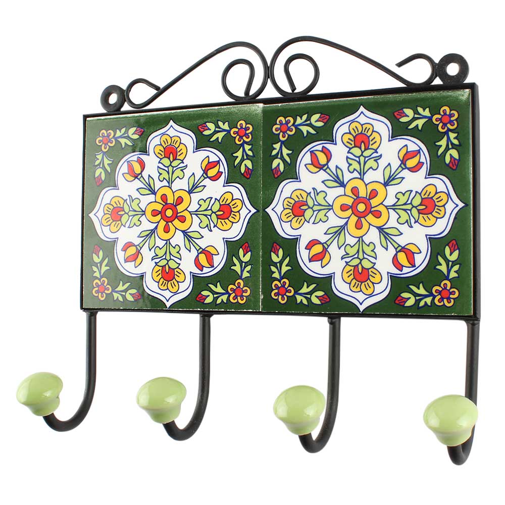 White Floral Ceramic Tile Hook. When Put on Wall or Cabinet It is An Art in Itself. The Metal Part of this Hook is Black Powder Coated.