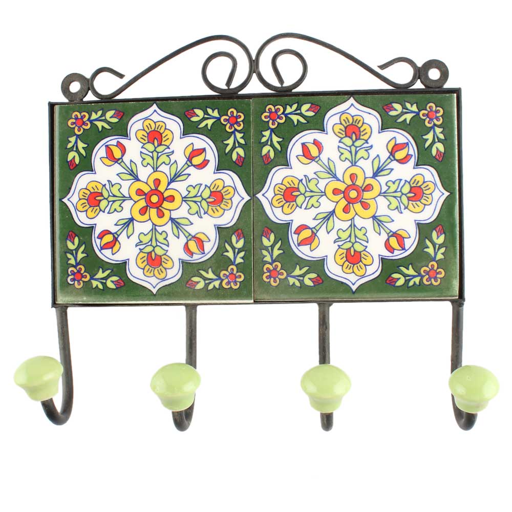 White Floral Ceramic Tile Wall Hook. When Put on Wall or Cabinet It is An Art in Itself. The Metal Part of this Hook is Black Powder Coated.
