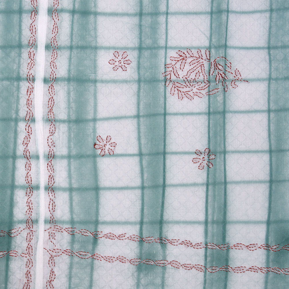 White- green cotton checkered double bed with pink chikankari design. Hand crafted supporting eye capturing designs and colours.