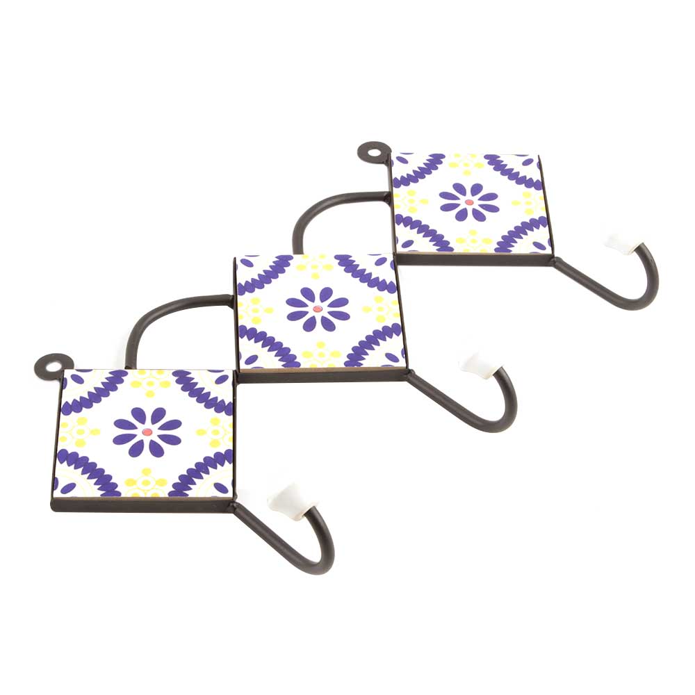 White Navy Blue Yellow Floral Tiles Hook. When Put on Wall or Cabinet It is An Art in Itself. the Metal Part of This Hook is Black Powder Coated.