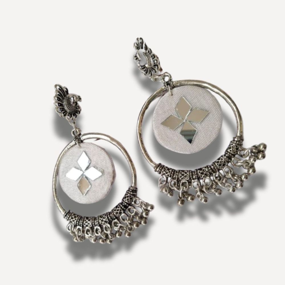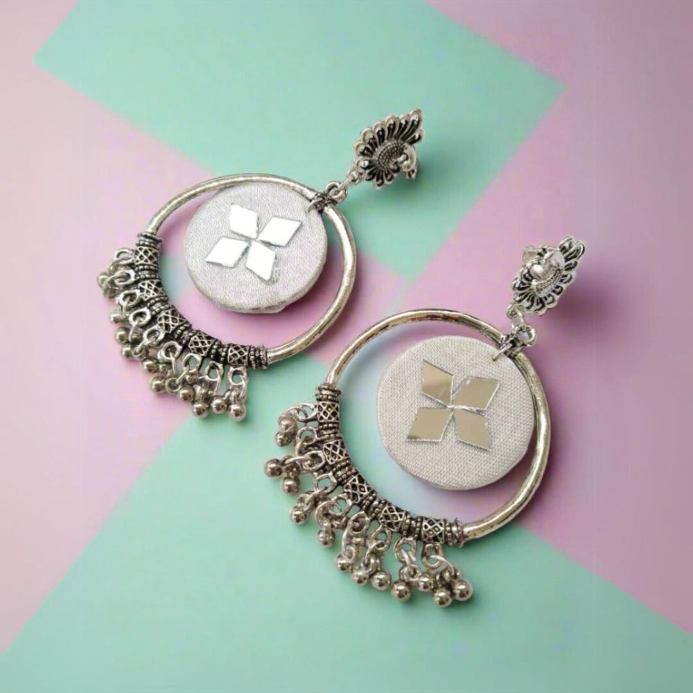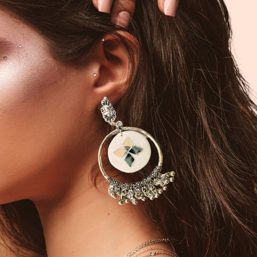 The White Oxidized Jhumka Bali Earrings blend timeless hoop styling with heritage-inspired detailing. Crafted on a fabric base, the clean white tone offers a fresh, versatile canvas, beautifully contrasted by oxidized silver elements. The Bali hoop form paired with a traditional jhumka creates movement and depth without visual heaviness. Designed for comfort and cultural expression, these earrings transition effortlessly from festive wear to everyday ethnic looks.