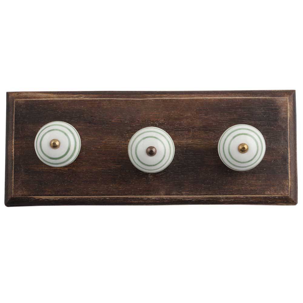 White Pea Green Strip Wooden Hooks . A Perfect Complement to the Soft Tone of the Wood are these White Traditional Hat Coat Hook Made of Genuine Porcelain and Brass. It can be use to Hang Jewellery, Leashes, Towels, Scarves, Light Weight Sweaters, Caps Etc.