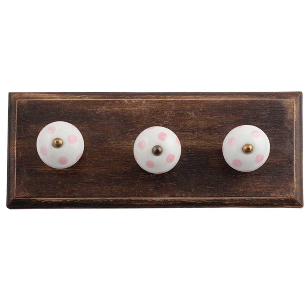 White Pink Dot Wooden Hooks. A Perfect Complement to the Soft Tone of the Wood are these White Traditional Hat Coat Hook Made of Genuine Porcelain and Brass. It can be use to Hang Jewellery, Leashes, Towels, Scarves, Light Weight Sweaters, Caps Etc.