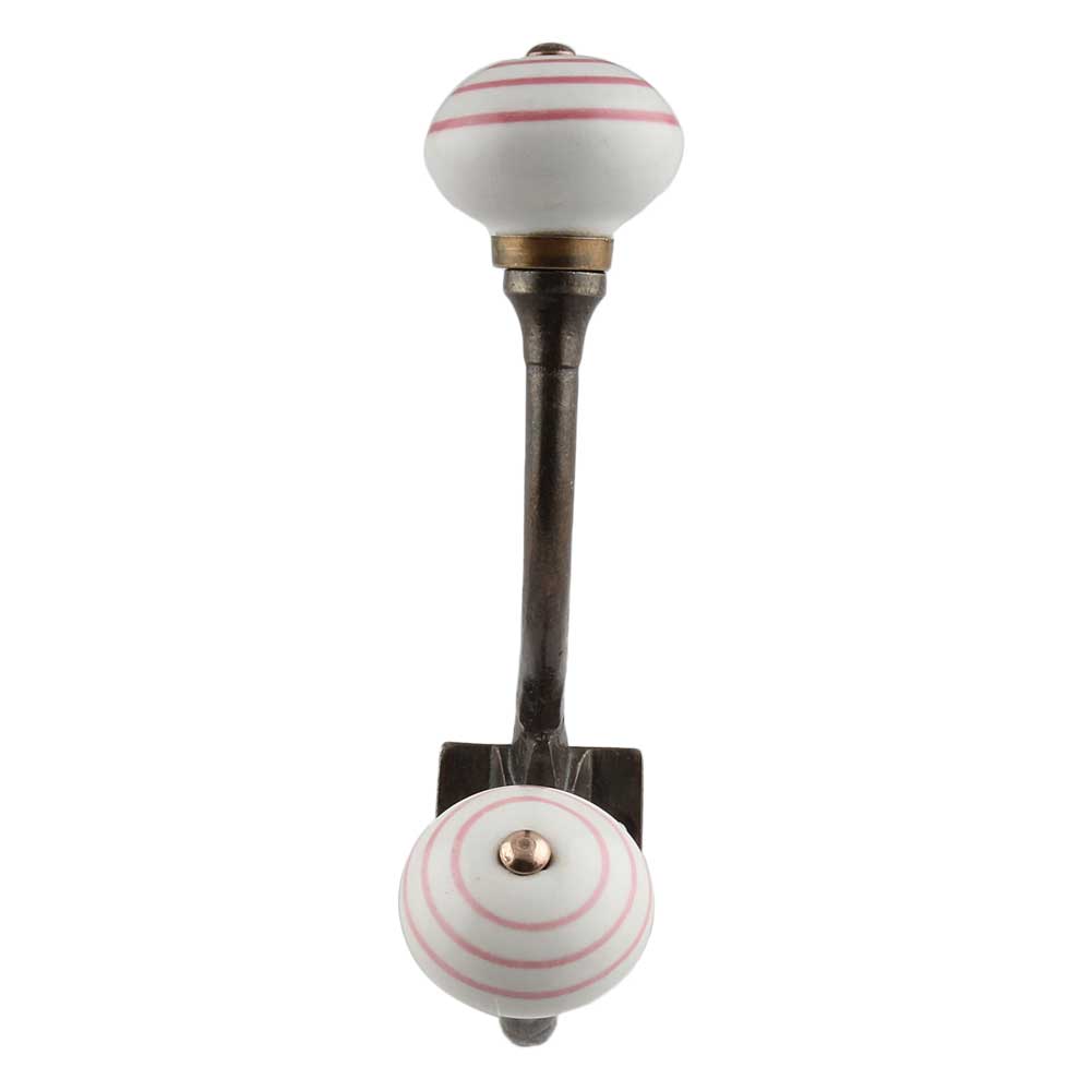 The White Pink Striped Ceramic Antique Iron Hook is a perfect blend of handcrafted beauty and everyday function. Featuring a hand-painted ceramic knob in delicate white and pink stripes, paired with a vintage-finished iron base, this hook brings charm and character to any wall. Designed for those who love subtle, pretty details in their home, it's both a decorative accent and a practical solution for hanging essentials. Whether used solo or in a set, it adds personality without overwhelming your space.