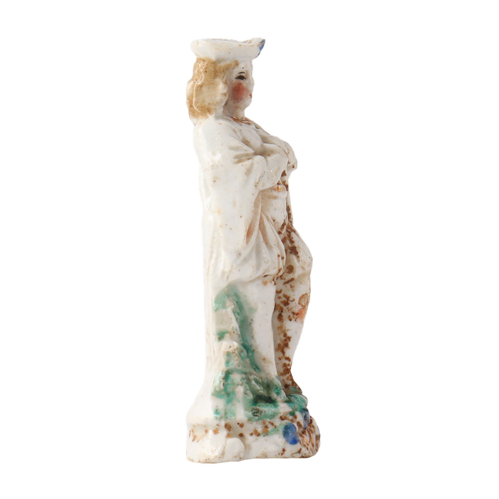 This is a rare porcelain figurines made of earthenware for mantel decor. The earliest figures that can be dated seem to be those of Queen Victoria. But when they were at their peak, they were mass-produced and frequently based on prints. They covered a wide range of topics, but those of actors and actresses were particularly well-liked. A man in costume figurine. He is dressed in breeches, a blue cape, shoes, and a white shirt with puffy sleeves. Use it as decor or a gift for family and friends.