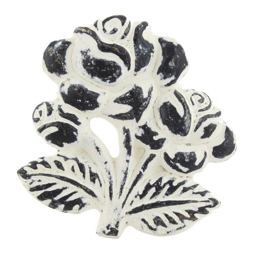 The White Rose with Branch Distressed Iron Dresser Knob features a beautifully detailed white rose paired with a branch design. The soft, elegant white color and intricate detailing bring a natural, classic look to any furniture piece.