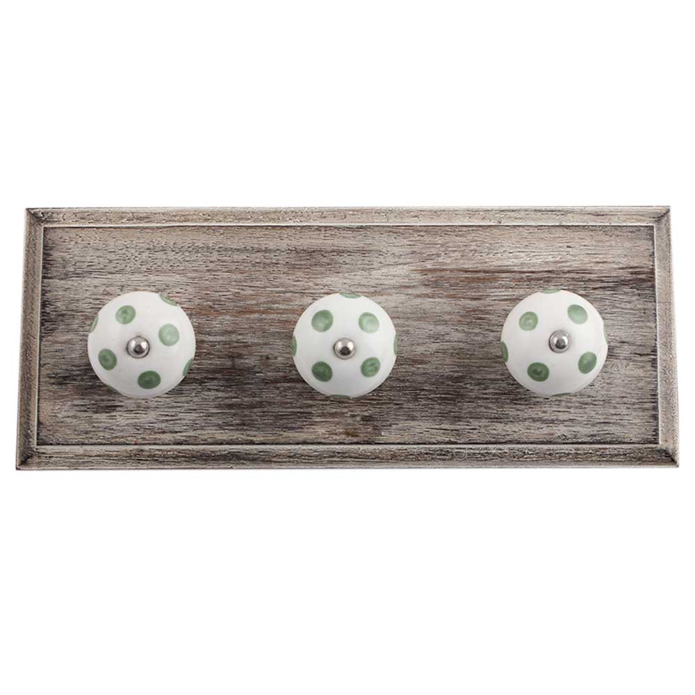 White Smoky Green Dot Wooden Hooks. A Perfect Complement to the Soft Tone of the Wood are these White Traditional Hat Coat Hook Made of Genuine Porcelain and Brass. It can be use to Hang Jewellery, Leashes, Towels, Scarves, Light Weight Sweaters, Caps Etc.