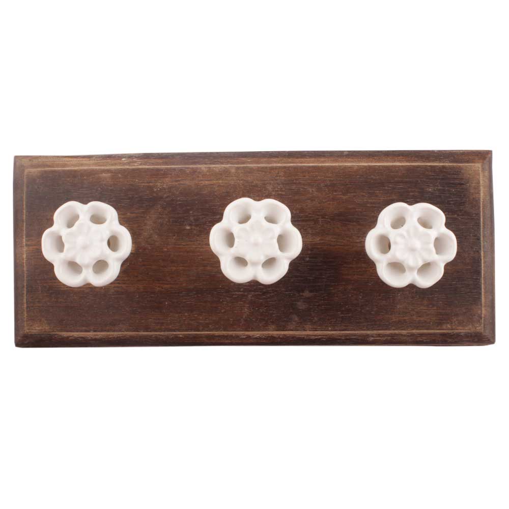 White Tiny Flower Ceramic Wooden Hooks. A Perfect Complement to the Soft Tone of the Wood are these White Traditional Hat and Coat Hook Made of Genuine Porcelain and Brass. It can be used to Hang Jewelry, Leashes, Towels, Scarves, Light Weight Sweaters, Caps etc.