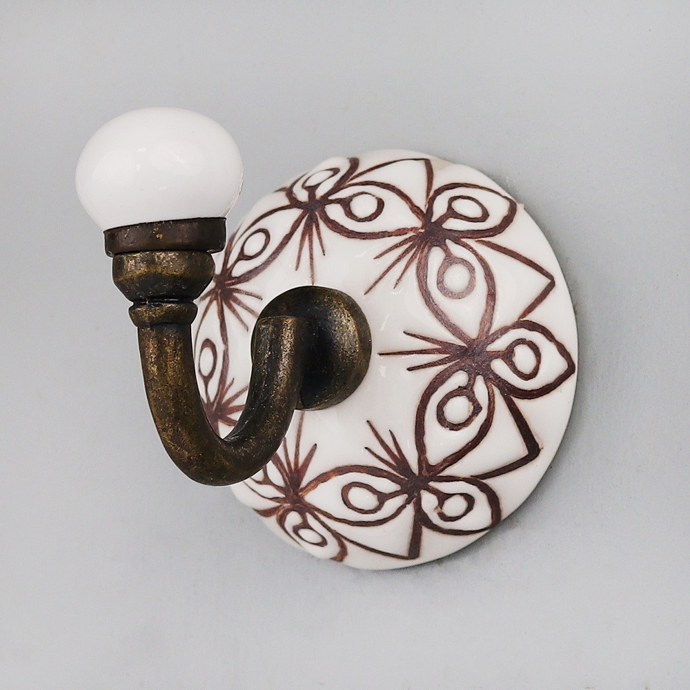 White With Brown Etched Ceramic Wall Hook. When Put on Wall or Cabinet It is An Art in Itself. This Hook is Strong Enough to Hold Your Cloths, Keys, Tea Cups, Coffee Mugs, Hand Towels etc.