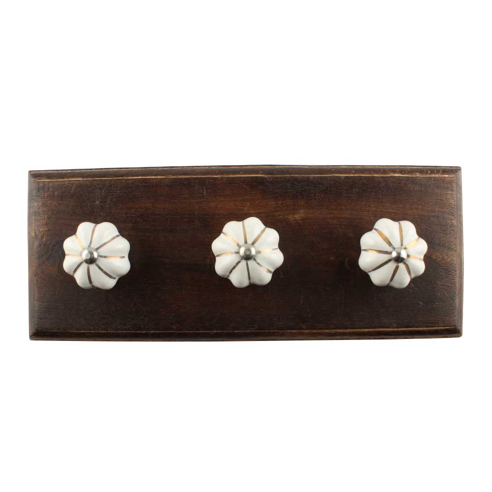 White With Golden Line Medium Ceramic Wooden Hook. A Perfect Complement to the Soft Tone of the Wood are these White Traditional Hat and Coat Hook Made of Genuine Porcelain and Brass. It can be used to Hang Jewelry, Leashes, Towels, Scarves, Light Weight Sweaters, Caps etc.