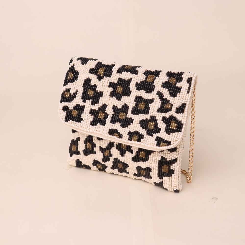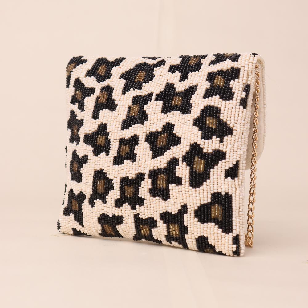 Turn heads with the fierce sophistication of the Wild Luxe Clutch — a hand-beaded masterpiece featuring a bold leopard print in rich ivory, black, and golden tones. Meticulously crafted for fashion-forward statements, this clutch brings texture, glamour, and wild elegance to your evening or daywear look. Finished with a detachable gold-tone chain strap, it effortlessly transitions from a sleek handheld clutch to a chic shoulder bag.
