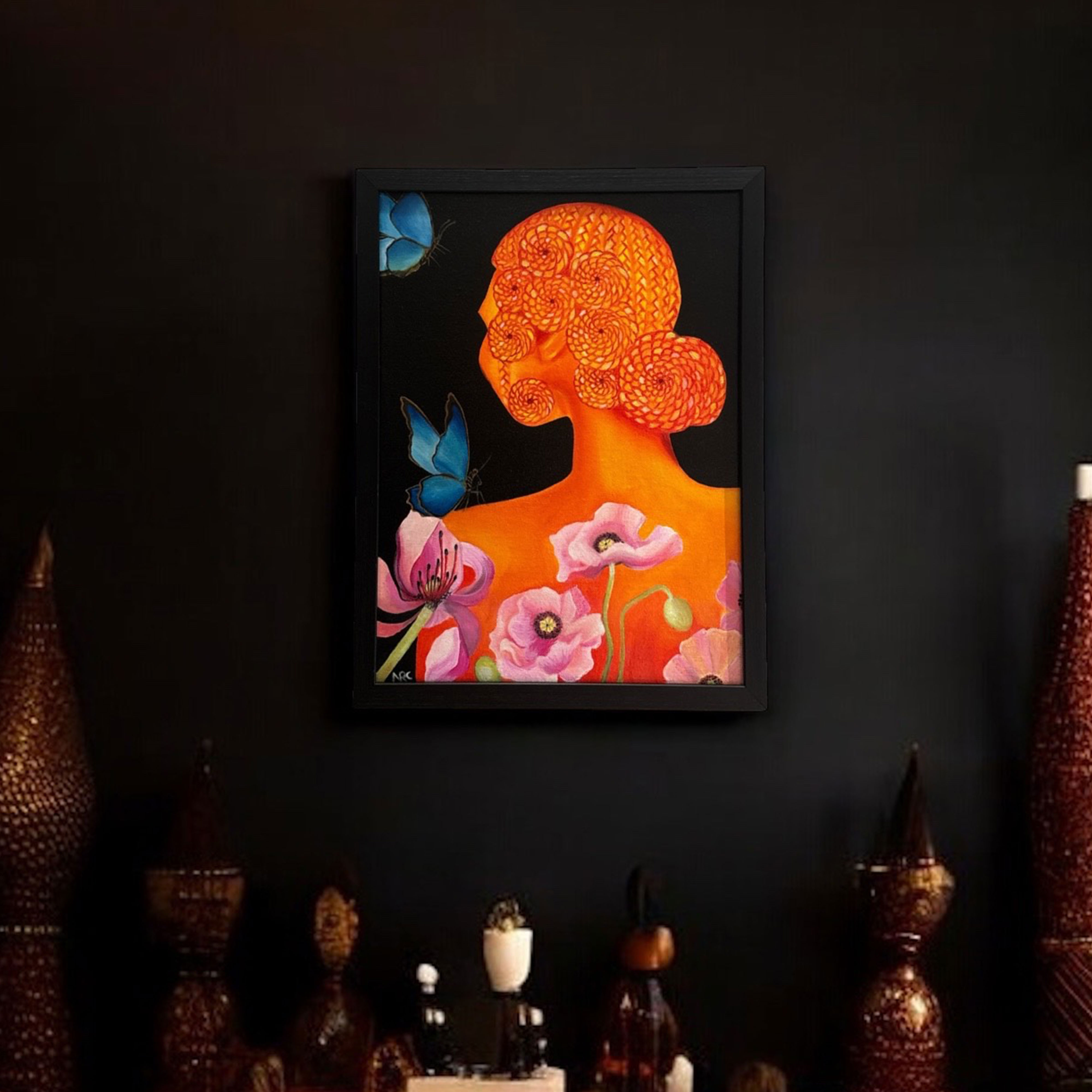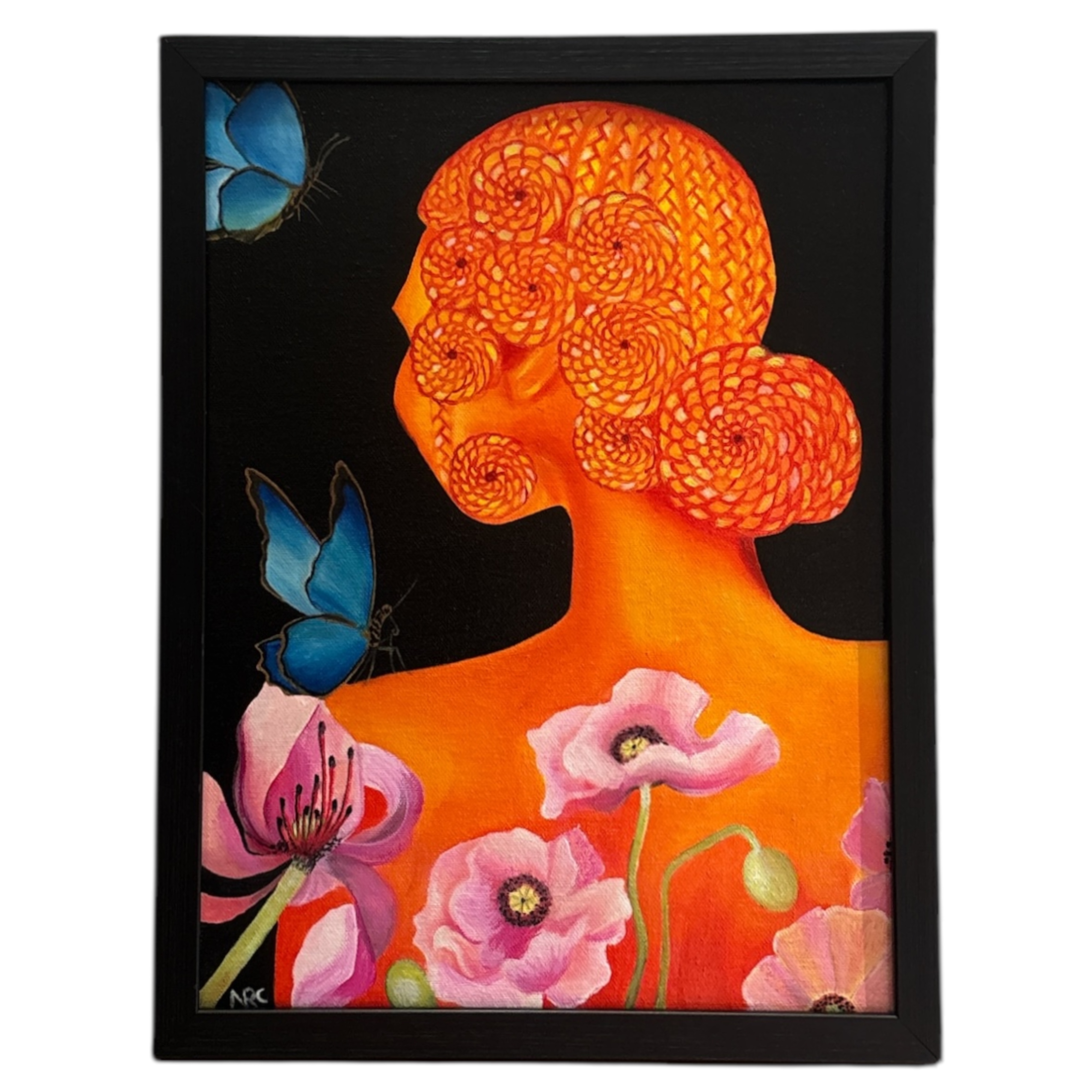 Oil painting of a woman of African descent highlighting intricate braid pattern with vibrant poppy flowers and blue butterflies. • With Frame