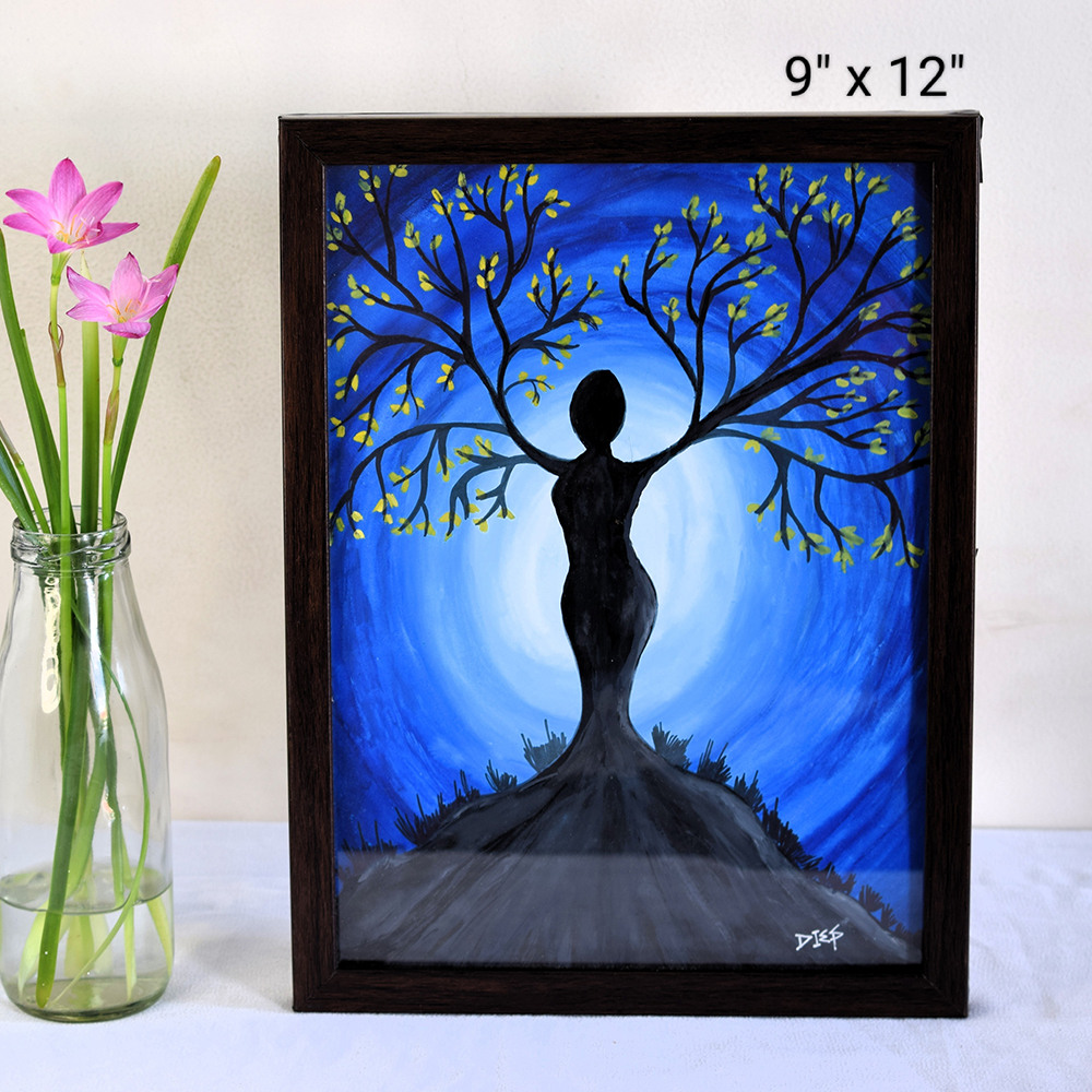 This powerful watercolor painting symbolizes strength, growth, and transformation. Depicting a woman gracefully blending into a flourishing tree, the artwork highlights the deep-rooted resilience and nurturing spirit of women. Artist Dimpana captures the essence of empowerment with rich shades of blue and vibrant foliage, making this 9" x 12" piece a compelling tribute to feminine energy and nature.