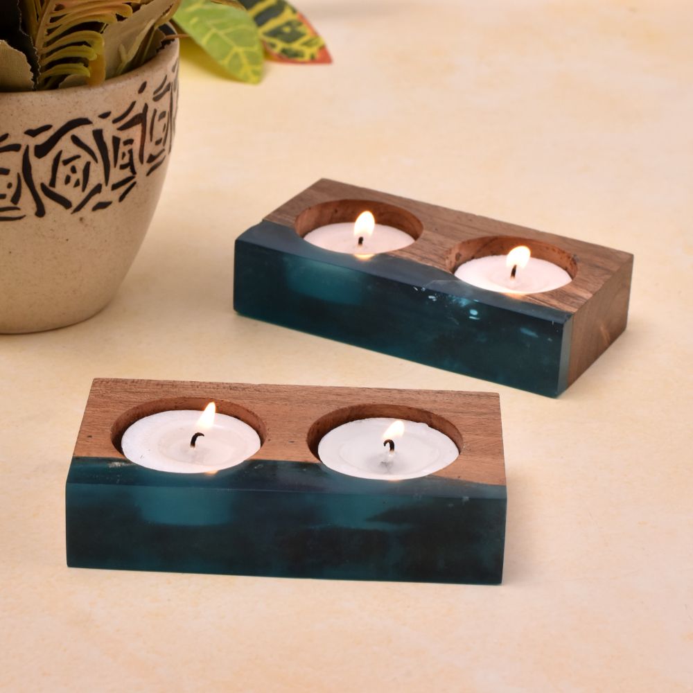 Wood and Epoxy Translucent Aqua Tea-Light Holder is a stunning and functional piece that will add warmth and elegance to any home decor. Its high-quality materials and unique design make it a perfect choice to create a cosy and inviting atmosphere in their home. It is a beautiful and unique addition to any home decor. The candle holder is wooden with translucent aqua epoxy, which gives it a stunning and modern look. The tea-light holder can hold two candles, creating a warm and inviting atmosphere. The translucent aqua epoxy adds a pop of colour and elegance to the natural wood, creating a beautiful and unique design that is both modern and timeless. The Wood and Epoxy Translucent Aqua Tea-Light Holder is perfect for any occasion, whether a romantic dinner for two or a relaxing night in. The soft glow of the candles and the beautiful translucent aqua epoxy design will create a calming and peaceful atmosphere. This candle holder is also an excellent gift for friends and family who appreciate the unique and stylish home decor. It is perfect for those who love natural and rustic, combined with modern design.