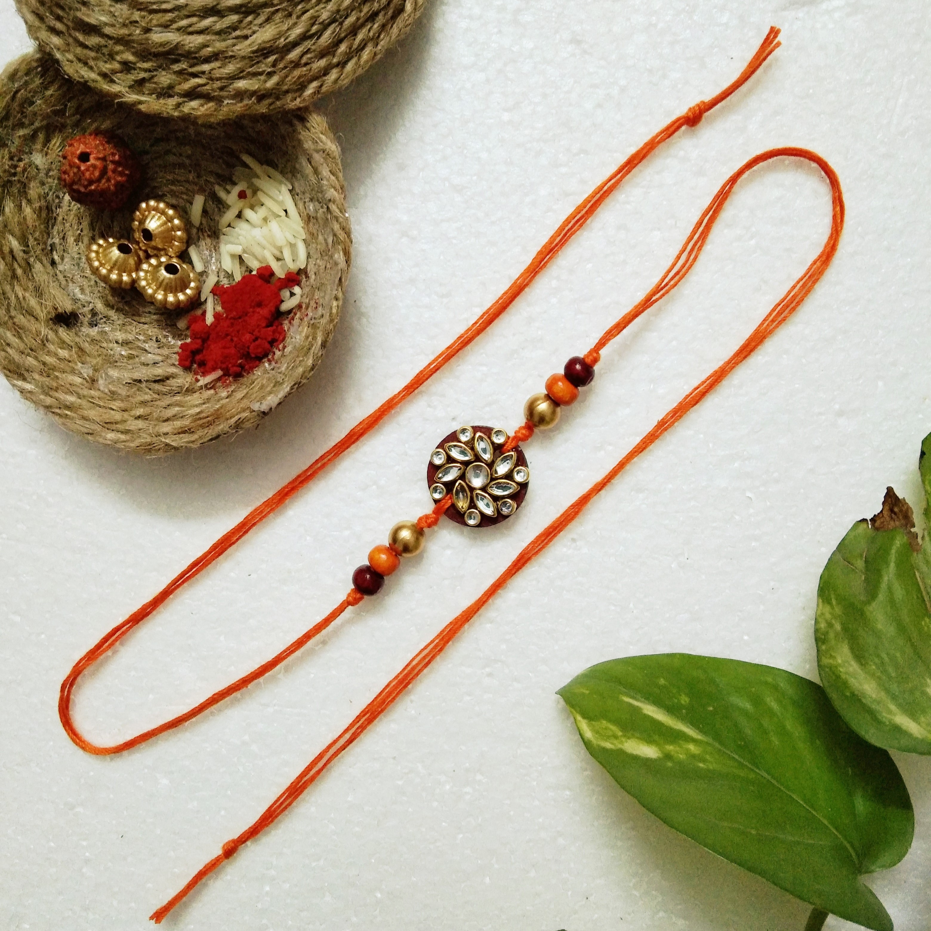 This rakhi stands out with its artistic use of wooden/acrylic beads, blending vibrant tradition with contemporary flair. Thoughtfully handcrafted, it's a memorable choice for this year's Raksha Bandhan.