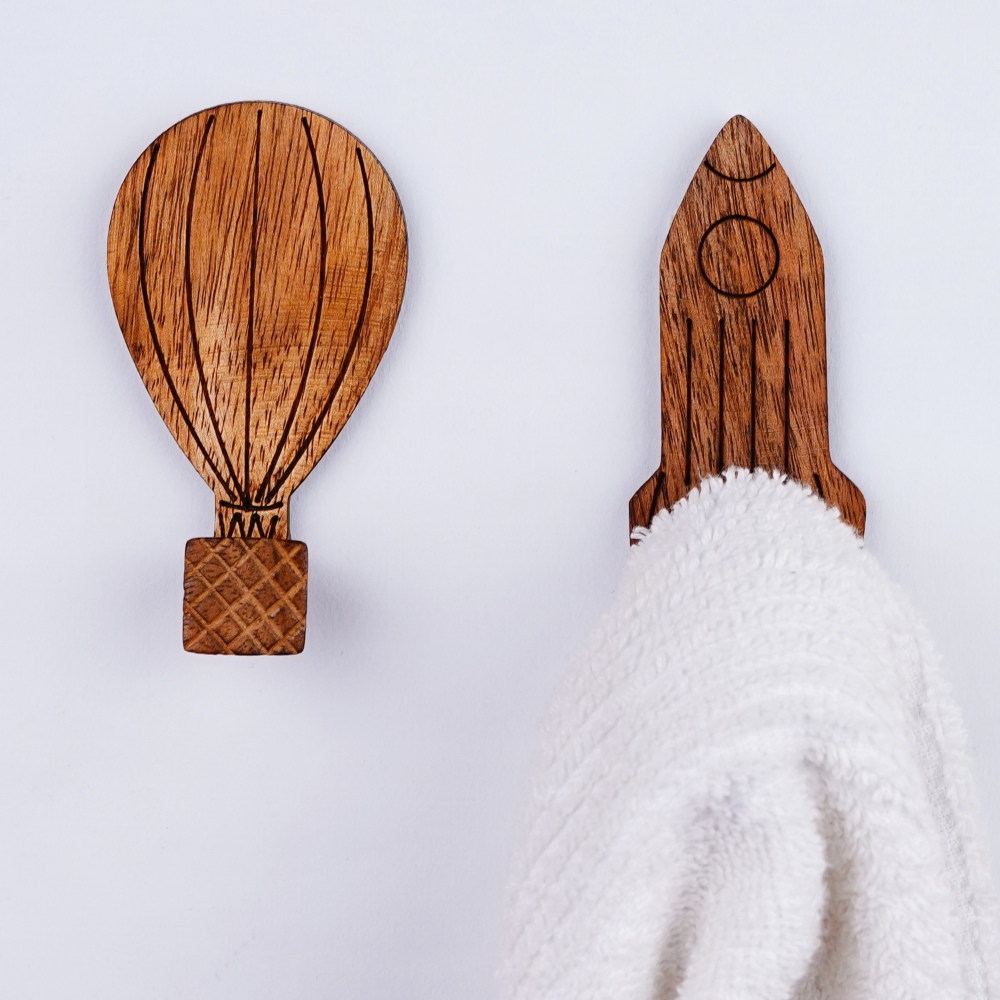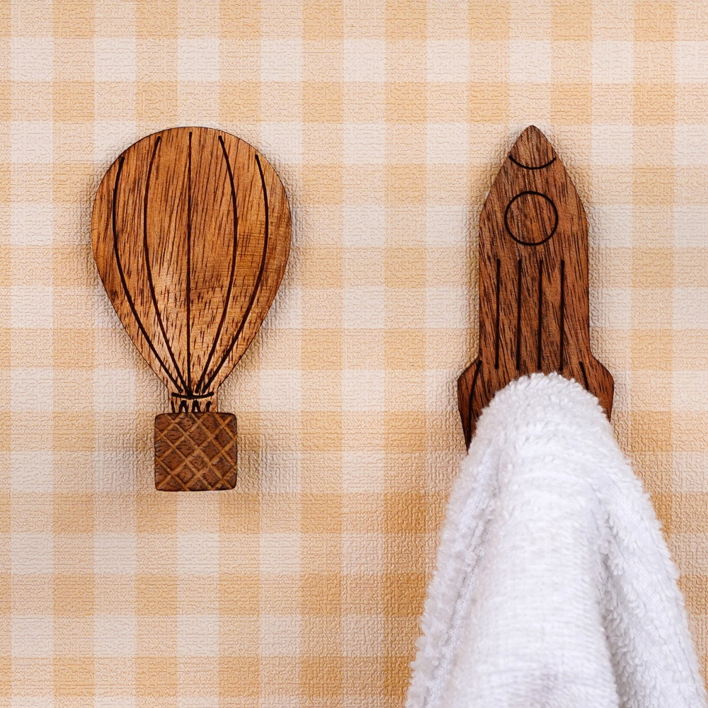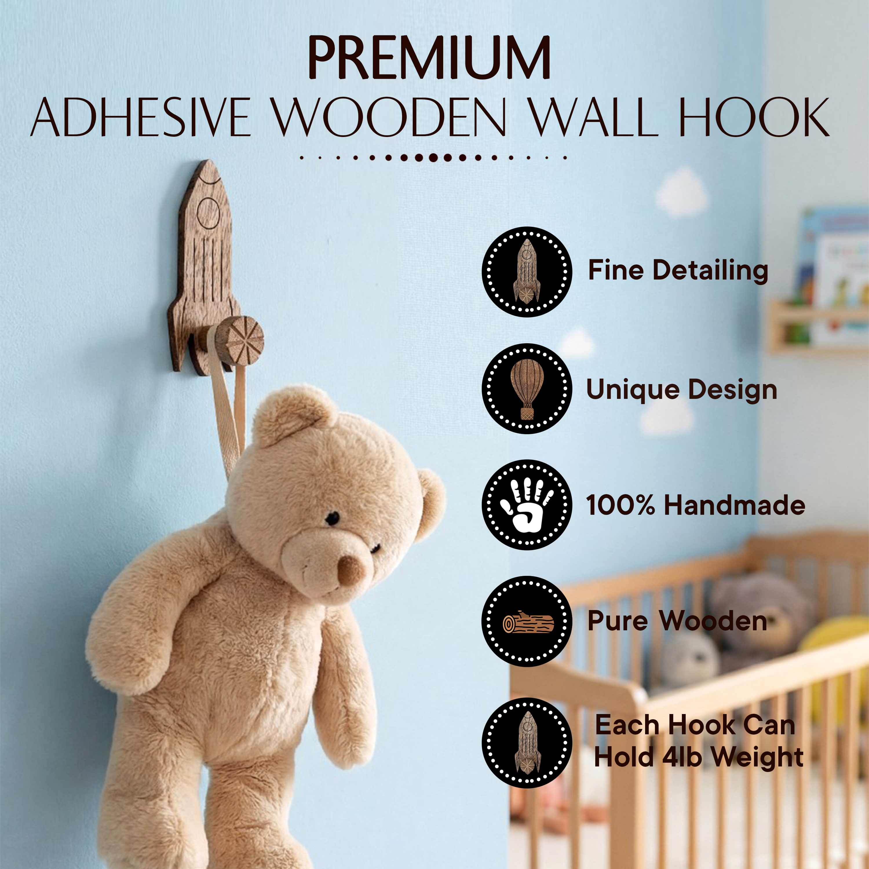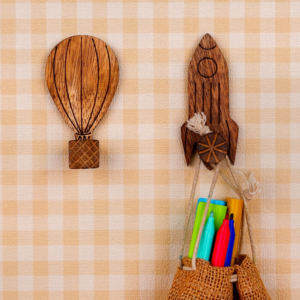 Wooden Adhesive Hot Air Balloon And Rocket Shape Wall Hooks Set of 2. This Hook is Strong Enough to Hold Your Cloths, Keys, Tea Cups, Coffee Mugs, Hand Towels Etc.