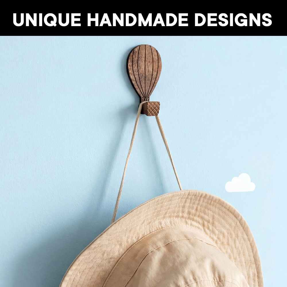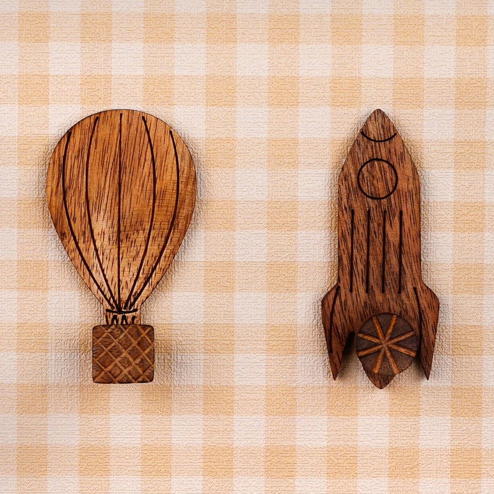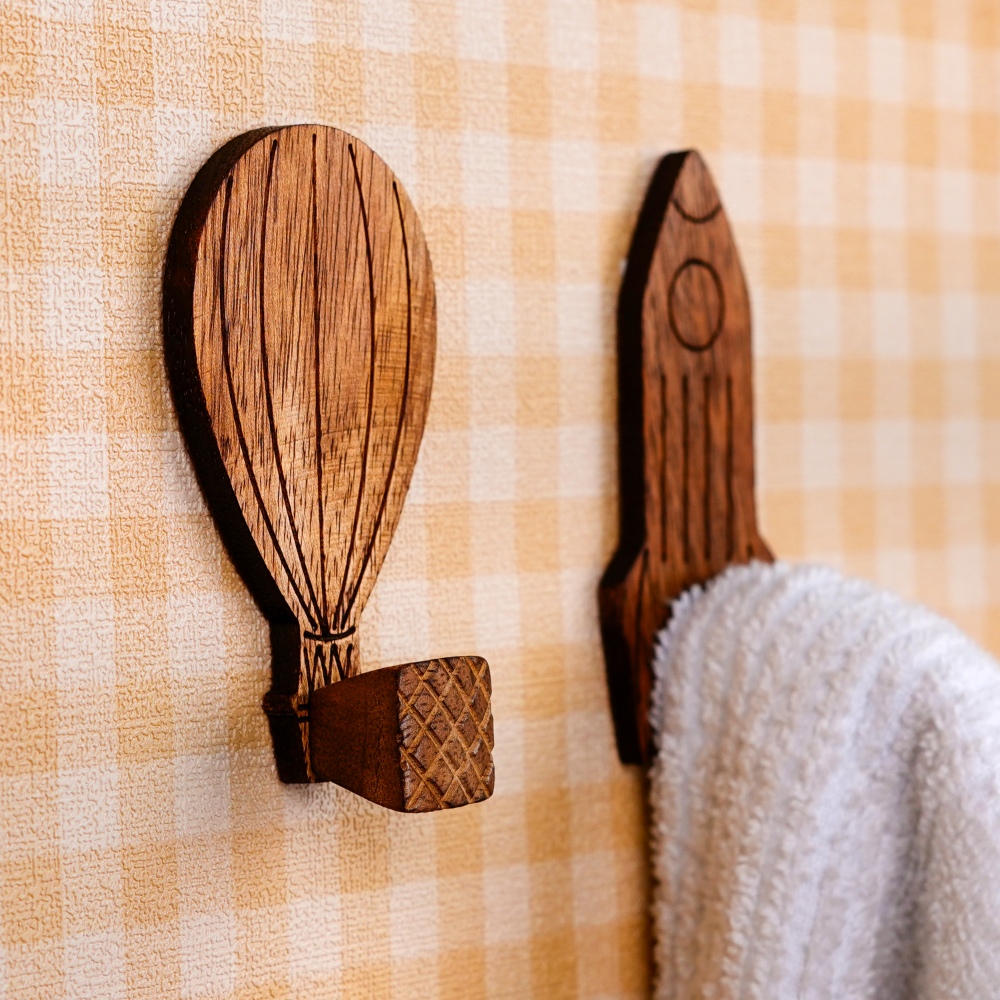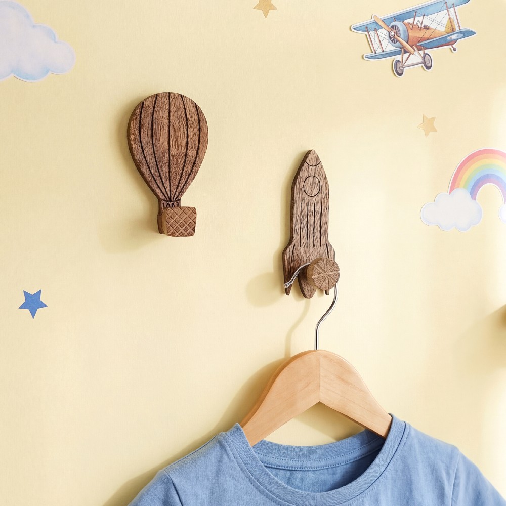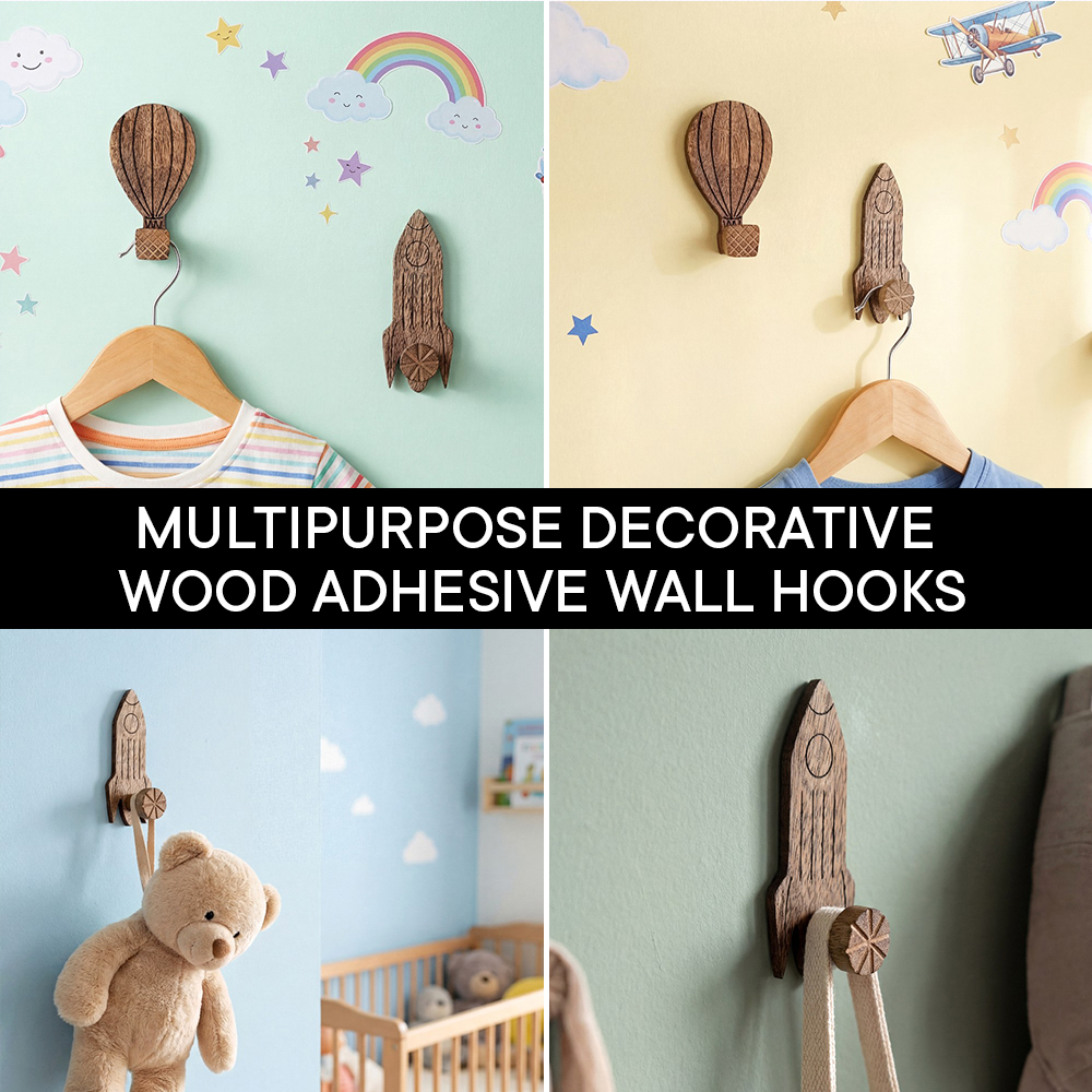 Wooden Adhesive Hot Air Balloon And Rocket Shape Wall Hooks Set of 2. This Hook is Strong Enough to Hold Your Cloths, Keys, Tea Cups, Coffee Mugs, Hand Towels Etc.