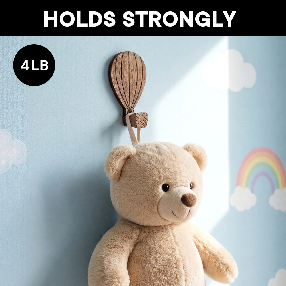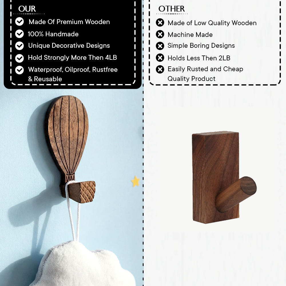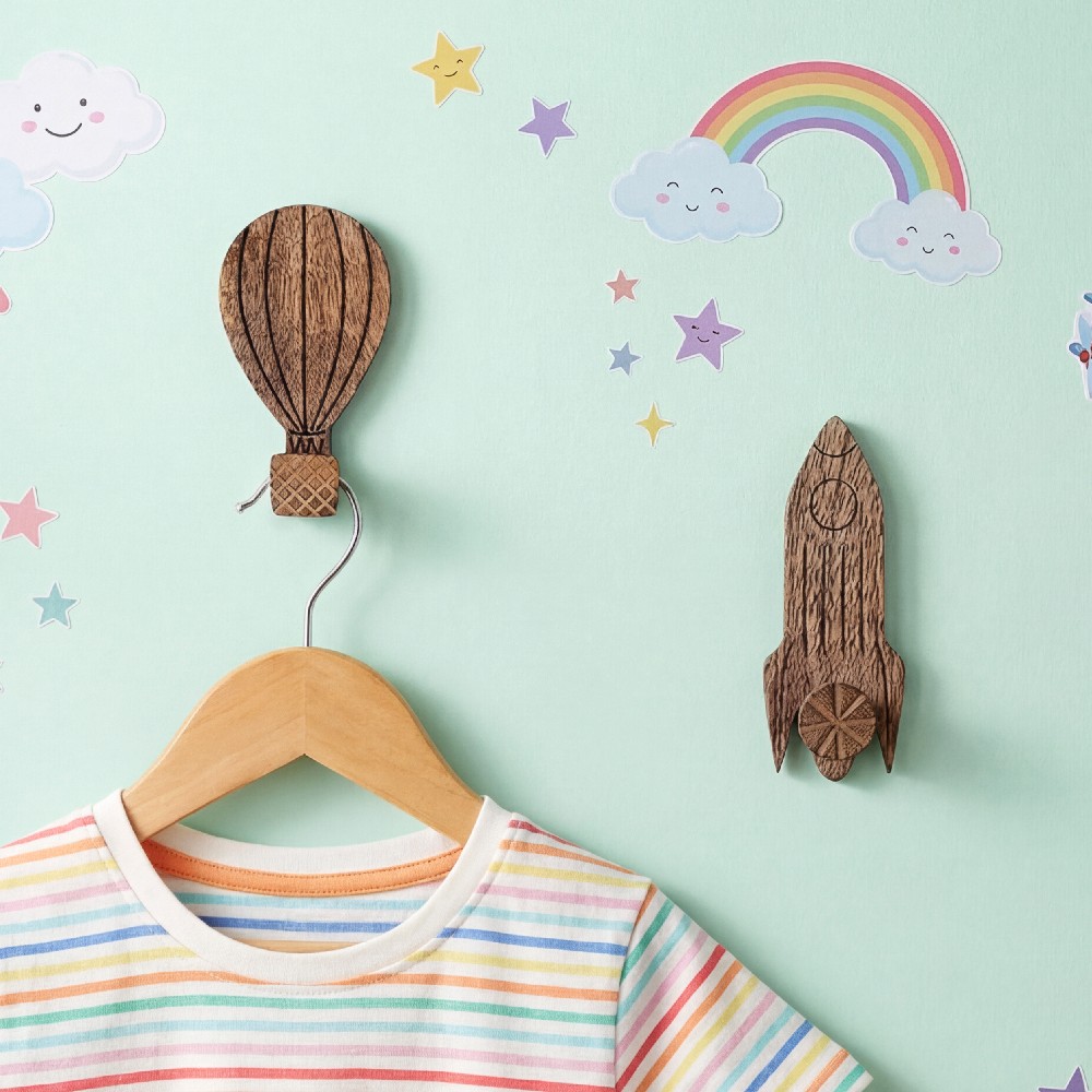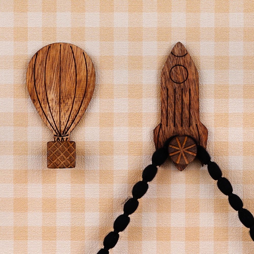 Wooden Adhesive Hot Air Balloon And Rocket Shape Wall Hooks Set of 2. This Hook is Strong Enough to Hold Your Cloths, Keys, Tea Cups, Coffee Mugs, Hand Towels Etc.