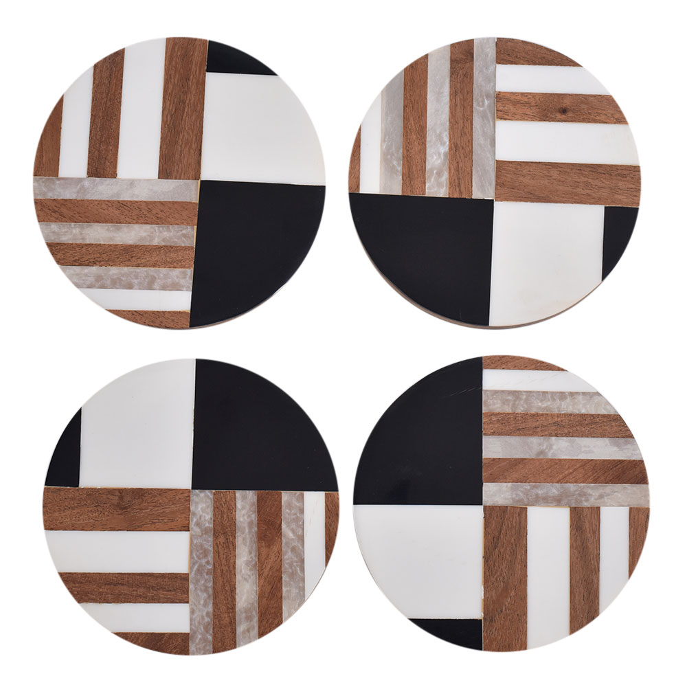 Handmade beautifully patterned geometric coasters highlights an eye-catching geometric wooden design while safeguarding your surfaces from heat and moisture. Your drinks will have never looked better. These coasters are made with wood and resin. Coaster sets of four are available. Ideal for use as a table decoration at home, hotels, and resorts.