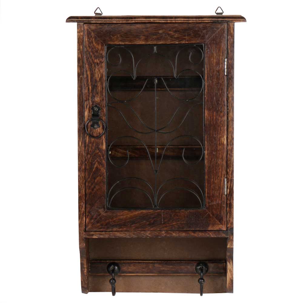 Featuring a wood frame and wrought iron accent, this box is perfect for adding vintage-inspired organization to the entryway.Crafted from glass, iron, metal, and mango wood Swing out cabinet door with Swing out cabinet door.