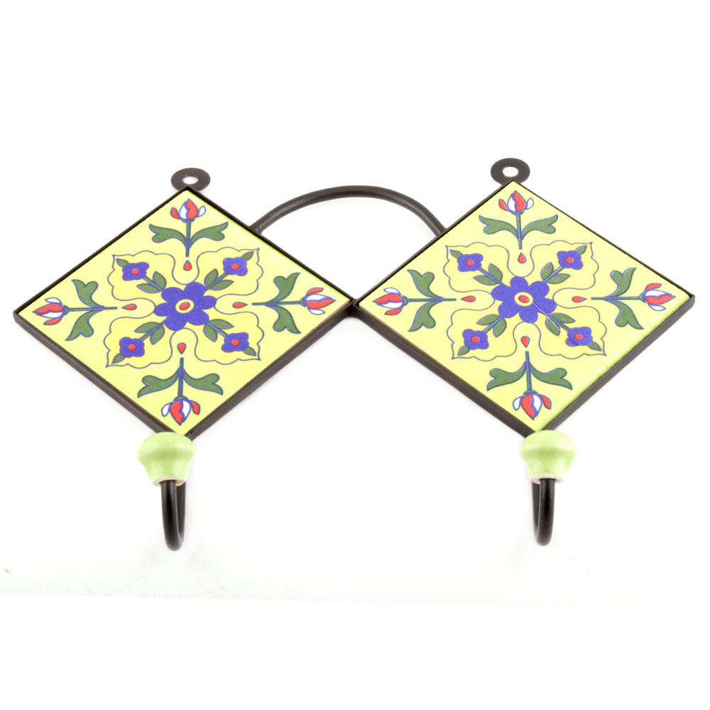 Yellow And Blue Ceramic Tiles Hooks. When Put on Wall or Cabinet it is an Art in itself. The Metal Part of this Hook is Black Powder Coated.