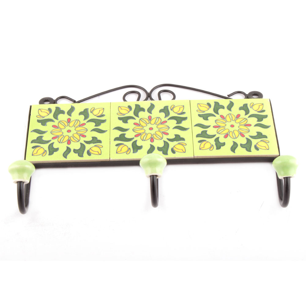 Yellow And Forest Green Flower Tiles Hooks Online. When Put on Wall or Cabinet it is an Art in itself. The Metal Part of this Hook is Black Powder Coated.