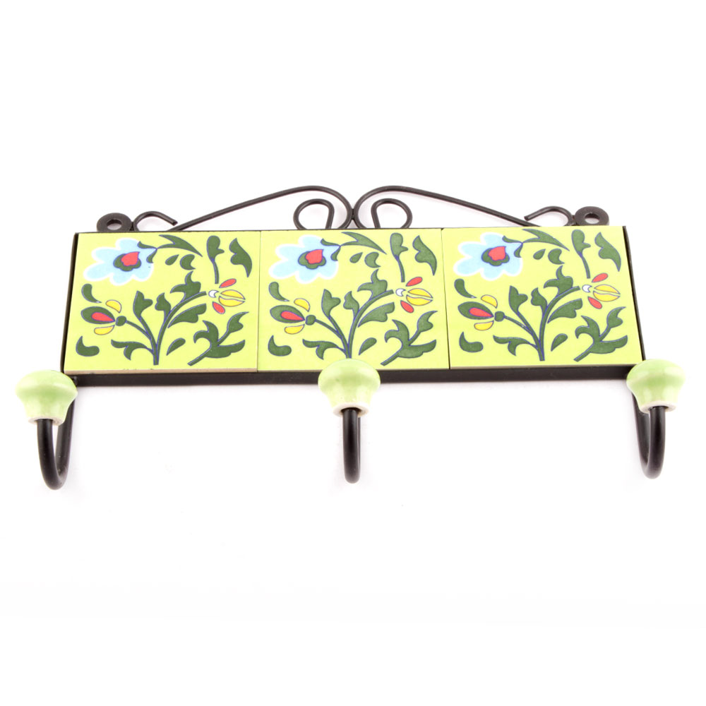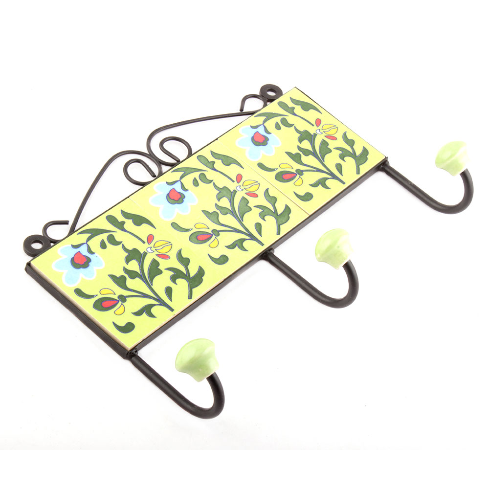 Yellow And Forest Green Leaf Floral Tiles Hooks Online. When Put on Wall or Cabinet it is an Art in itself. The Metal Part of this Hook is Black Powder Coated.