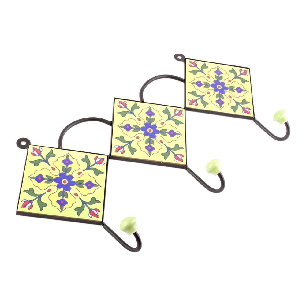 Yellow And Navy Blue Tiny Flower Ceramic Tiles Hooks. When Put on Wall or Cabinet it is an Art in itself. The Metal Part of this Hook is Black Powder Coated.