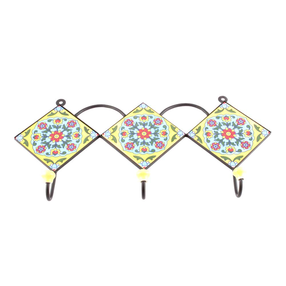 Yellow And Turquoise Ceramic Floral Tiles Hooks. When Put on Wall or Cabinet it is an Art in itself. The Metal Part of this Hook is Black Powder Coated.