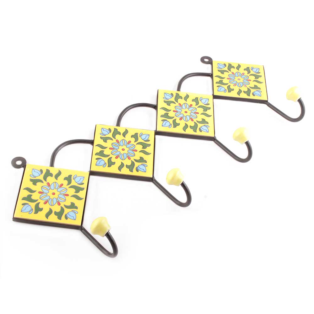 Yellow And Turquoise Tiny Floral Ceramic Tiles Hooks. When Put on Wall or Cabinet It is An Art in Itself. The Metal Part of this Hook is Black Powder Coated.