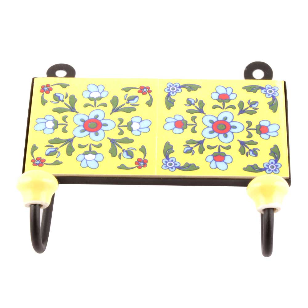 Yellow And Turquoise Tiny Flower Ceramic Tiles Hooks. When Put on Wall or Cabinet it is an Art in itself. The Metal Part of this Hook is Black Powder Coated.