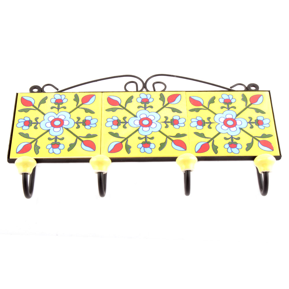 Yellow And Turquoise Tiny Flower Tiles Hooks. When Put on Wall or Cabinet it is an Art in itself. The Metal Part of this Hook is Black Powder Coated.