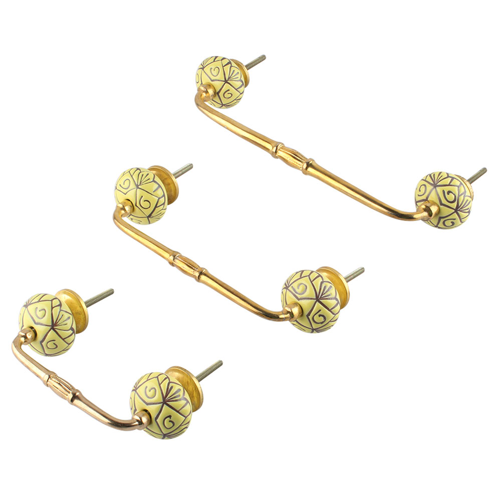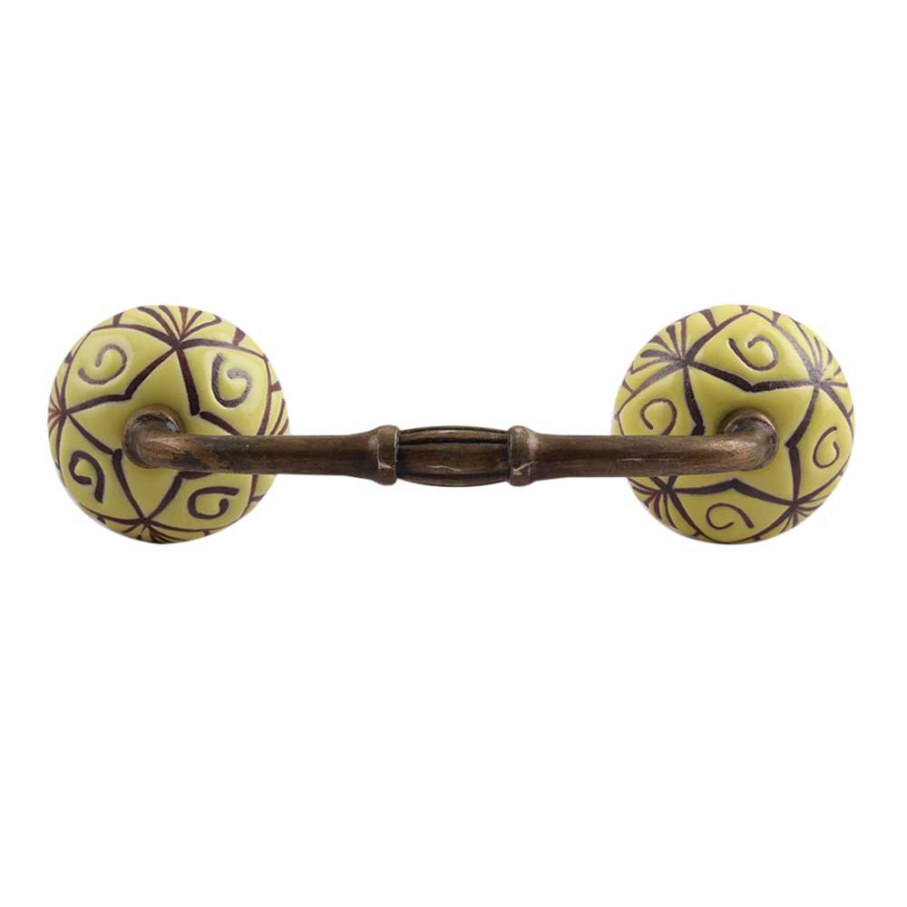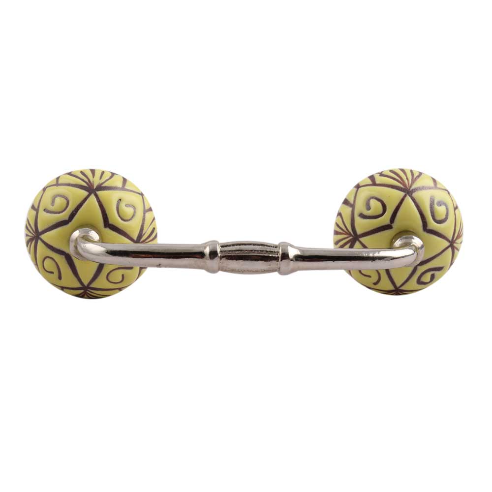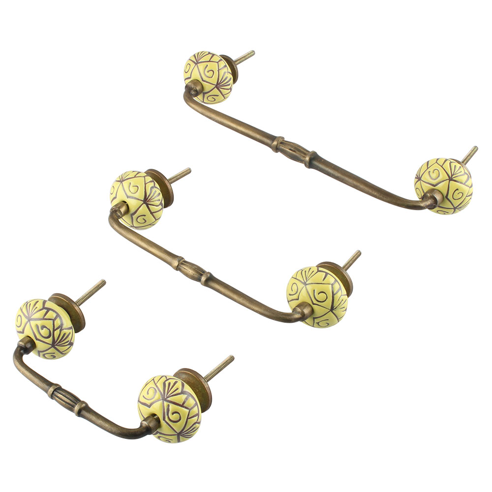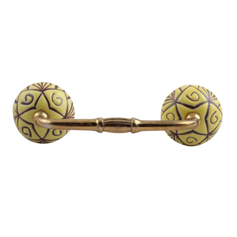 Yellow Base Brown Etched Ceramic Floral Bridge Handle. Ideal for Drawer, Dresser, Cabinet, Wardrobe, Cupboard and Almirah.