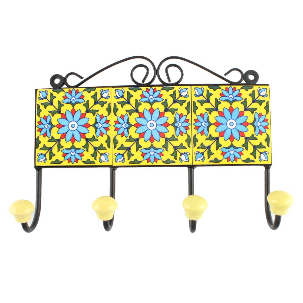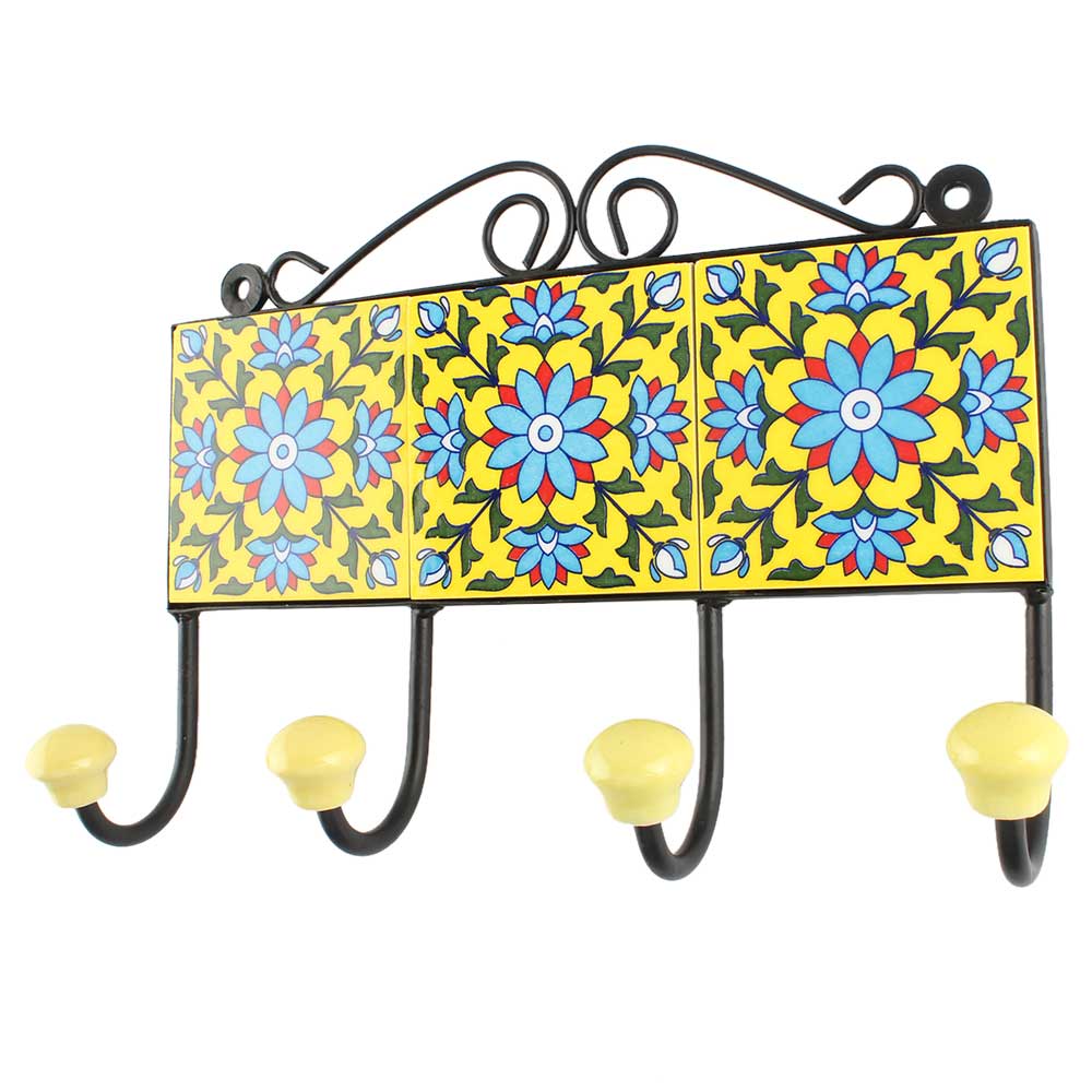 Yellow Base Turquoise Sunflower Ceramic Tile Hook. When Put on Wall or Cabinet It is An Art in Itself. The Metal Part of this Hook is Black Powder Coated.
