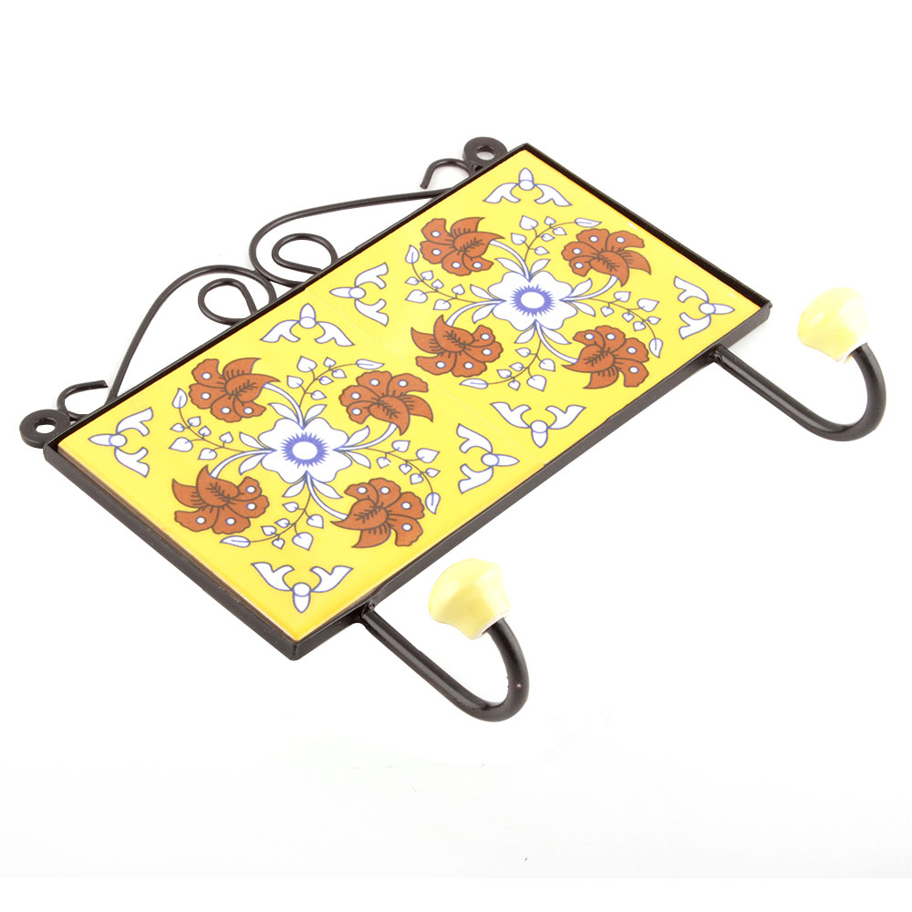 Yellow Brown Flower Tiles Hooks. When Put on Wall or Cabinet it is an Art in itself. The Metal Part of this Hook is Black Powder Coated.