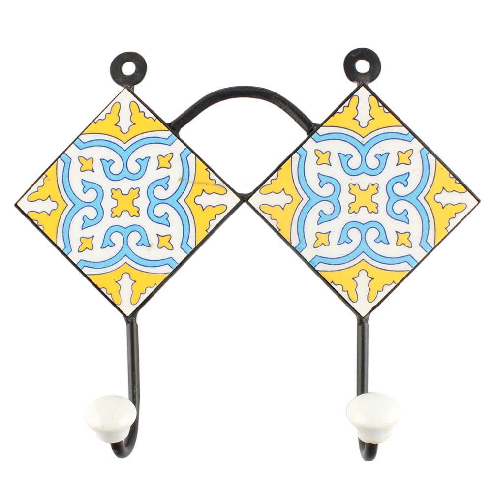 Yellow Ceramic Floral Tile Hook. When Put on Wall or Cabinet It is An Art in Itself. The Metal Part of this Hook is Black Powder Coated.