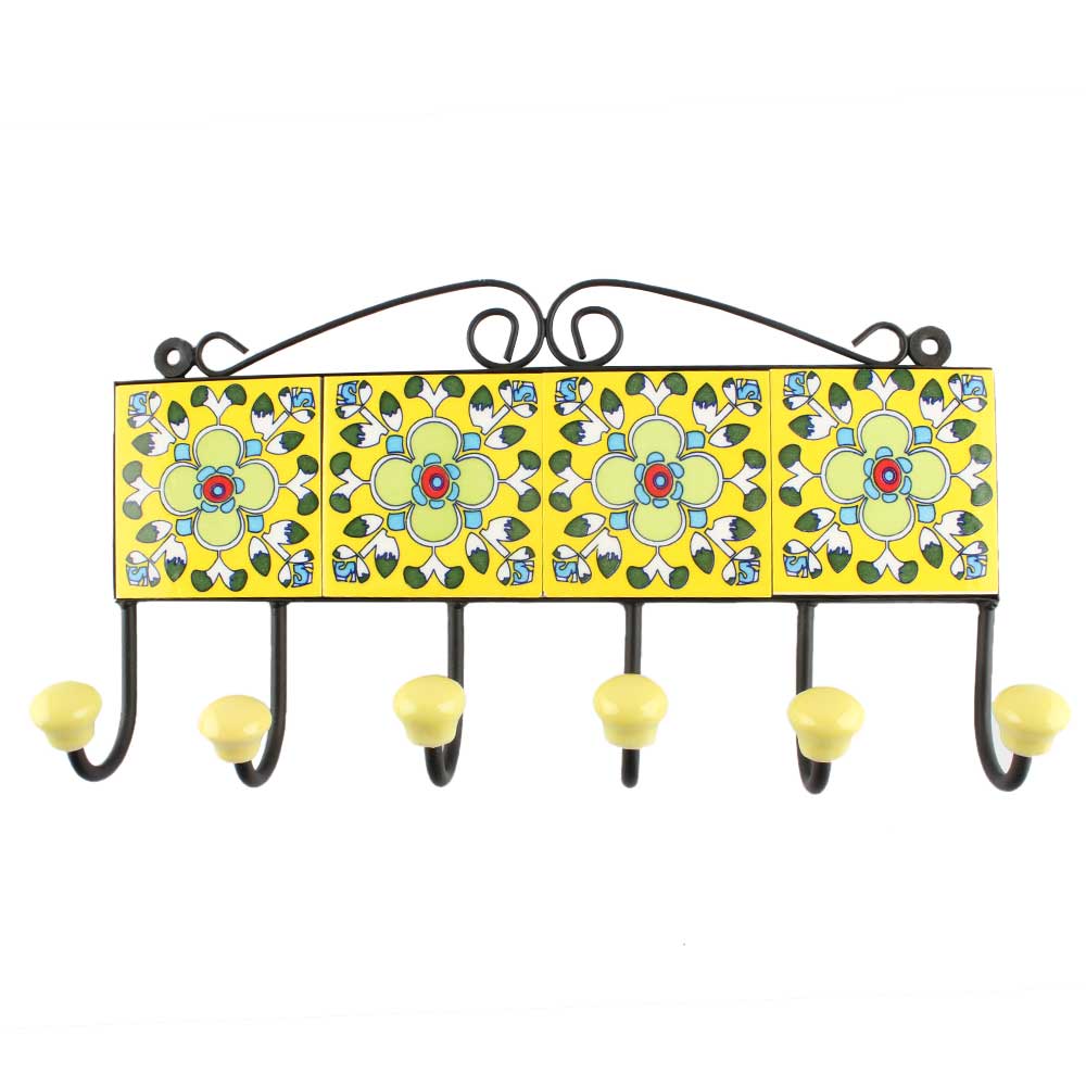 Yellow Ceramic Floral Tile Hook. When Put on Wall or Cabinet It is An Art in Itself. The Metal Part of this Hook is Black Powder Coated.