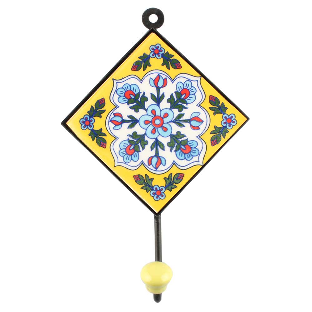 Yellow Ceramic Floral Tiles Hook . When Put on Wall or Cabinet It is An Art in Itself. The Metal Part of this Hook is Black Powder Coated.